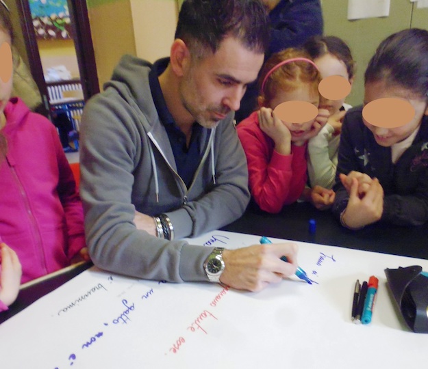 I bambini si sono sentiti subito protagonisti di questo evento in quanto anche loro usano tutti i giorni la scrittura a mano. Sono cominciate così alcune riflessioni sul corsivo che loro imparano e scrivono nella quotidianità: "corsivo vuol dire "andare di fretta", "per scrivere in corsivo bisogna stare comodi con il corpo", "ognuno di noi ha una grafia personale e che la tua scrittura cambia dall'umore che hai".