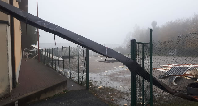Il palazzetto dell'oratorio Paolo VI e i danni riportati a seguito delle potenti raffiche di vento