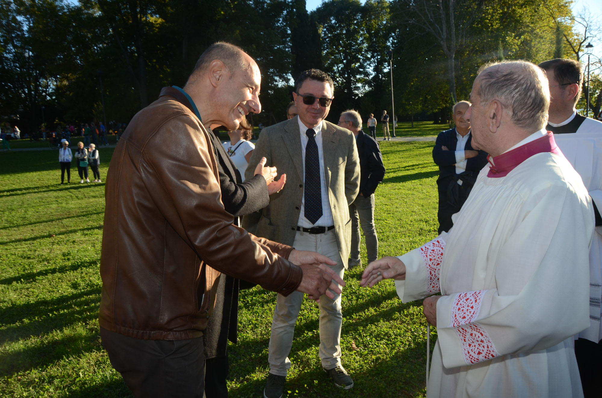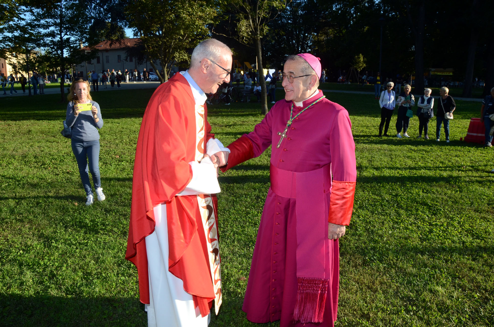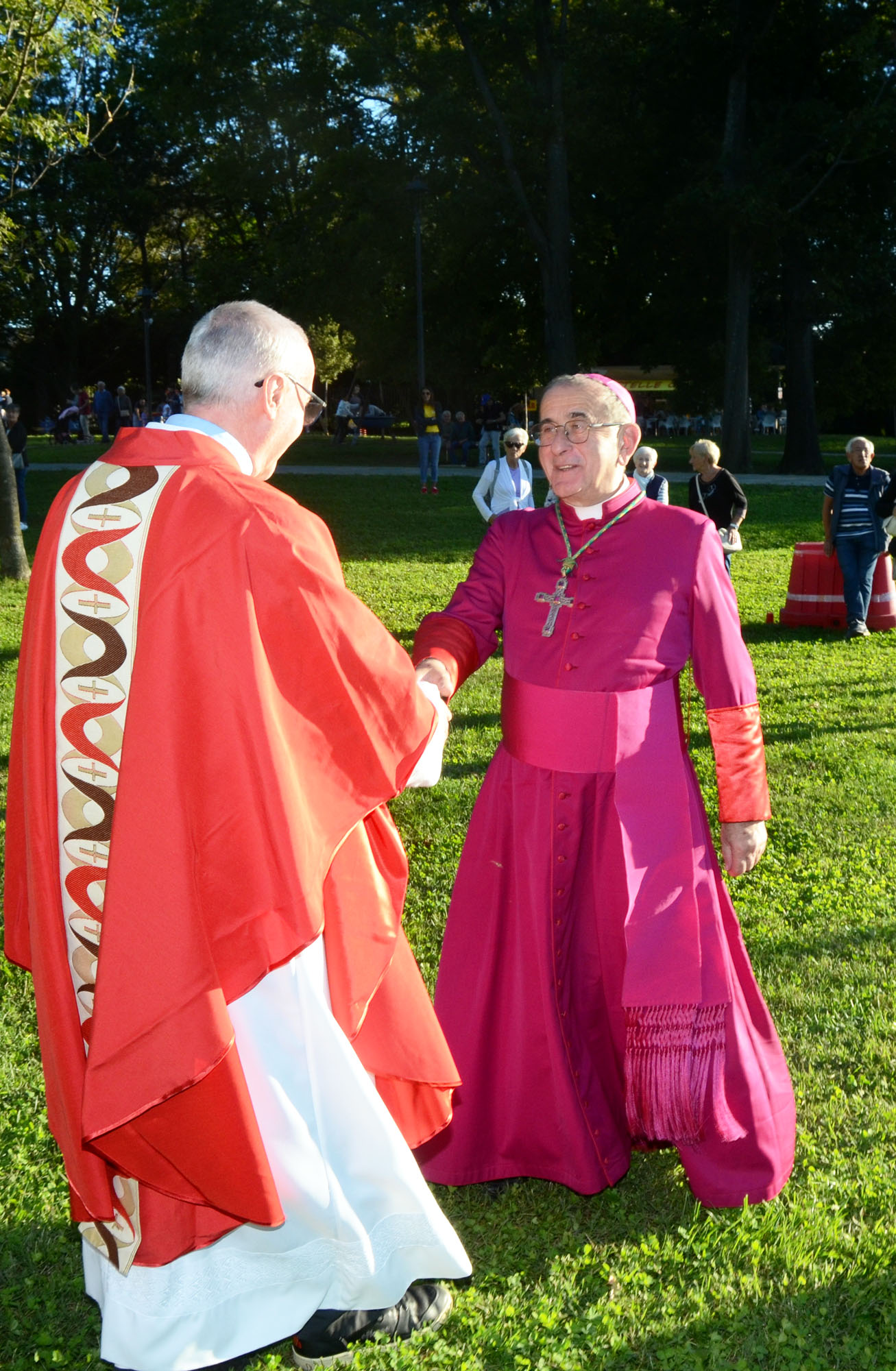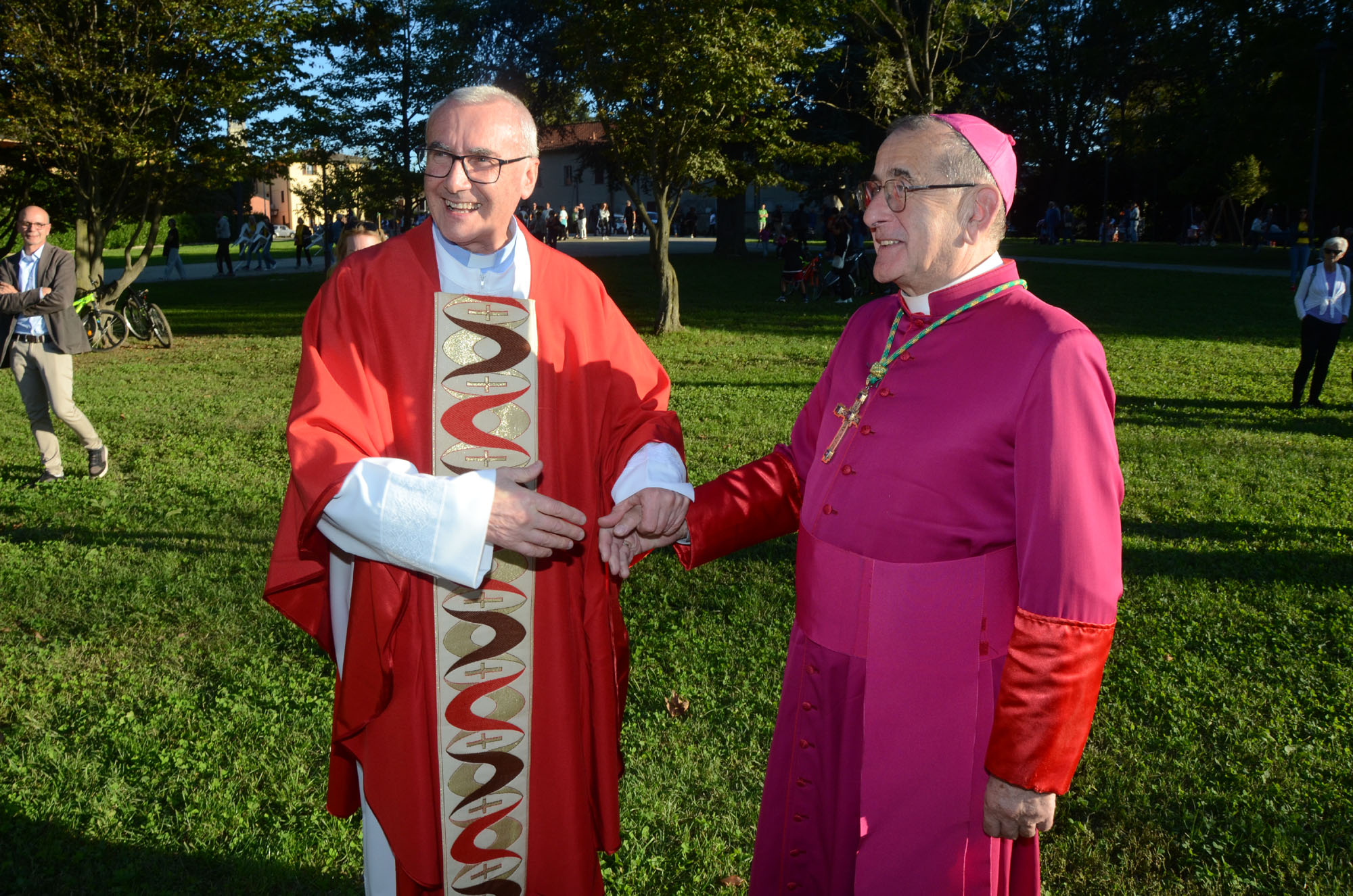 Il saluto tra monsignor Delpini e il parroco don Emilio Colombo
