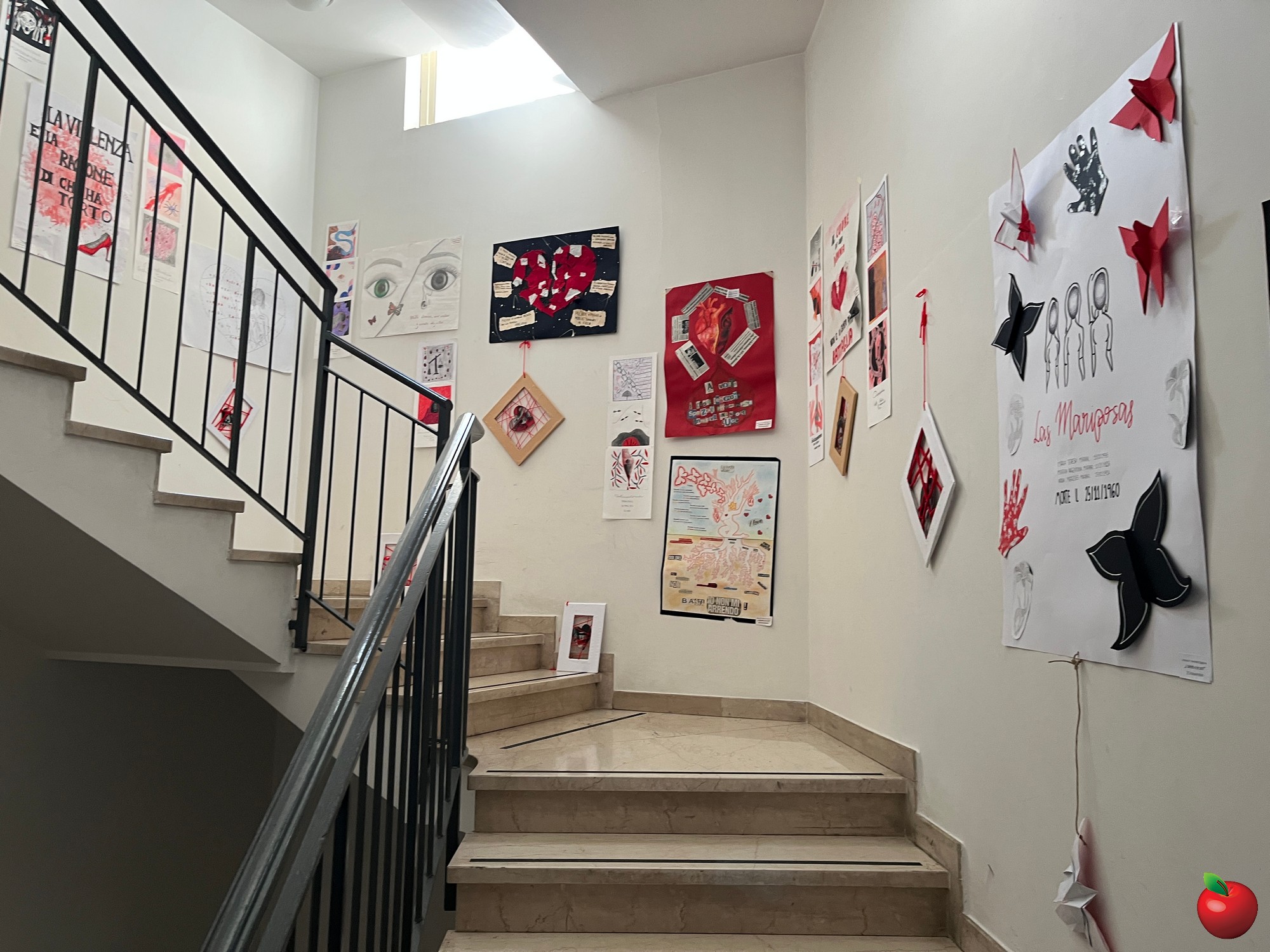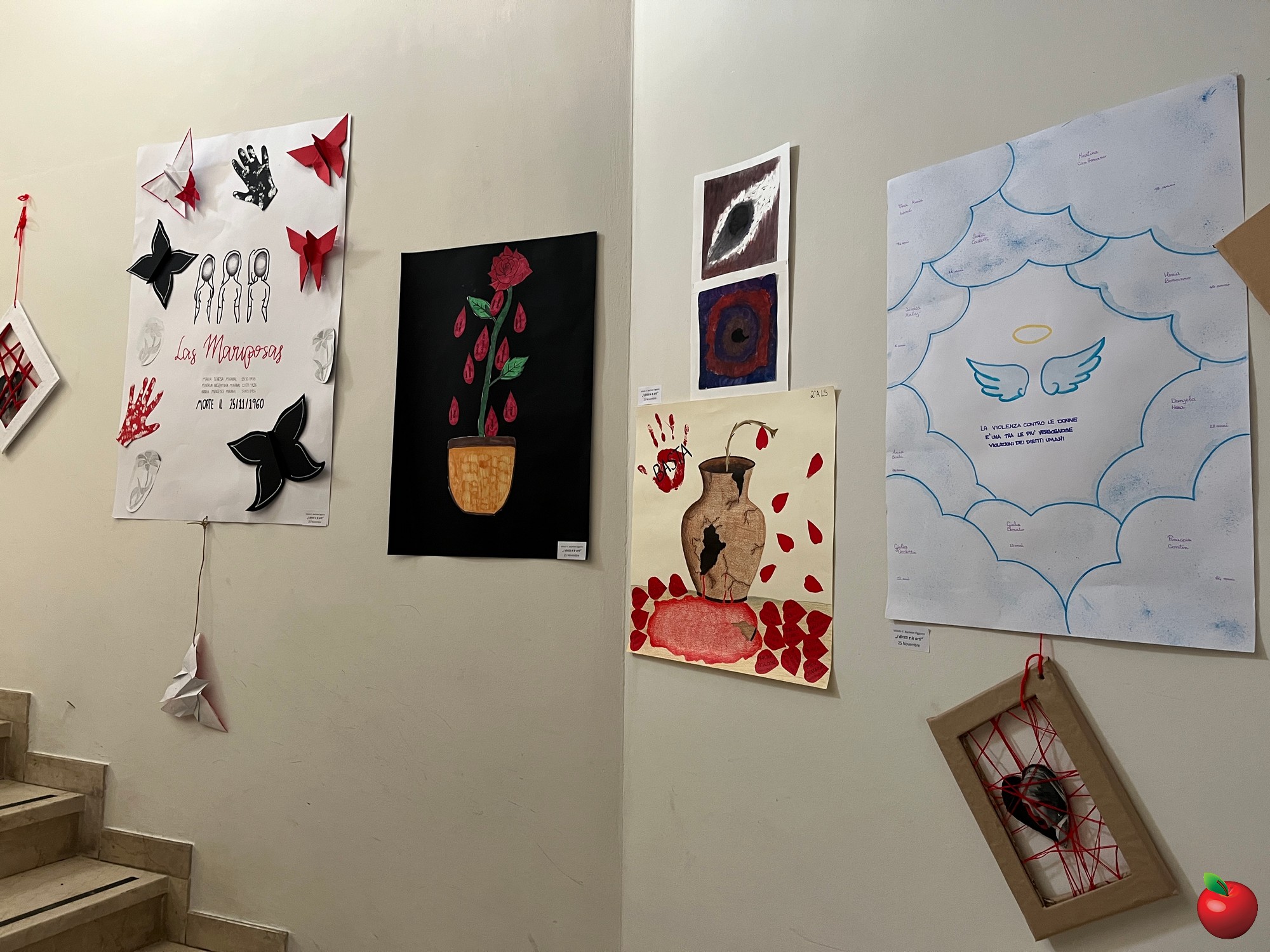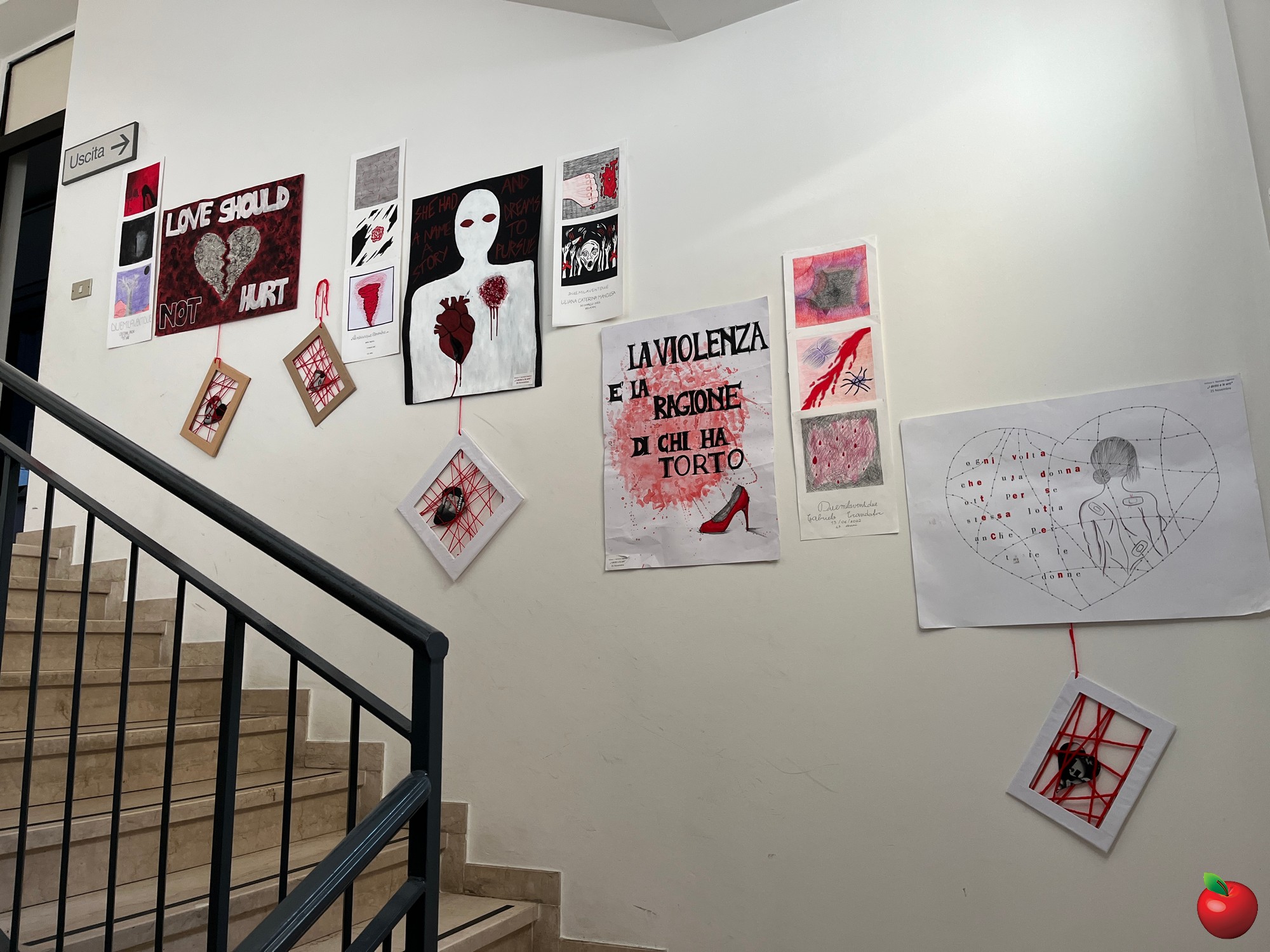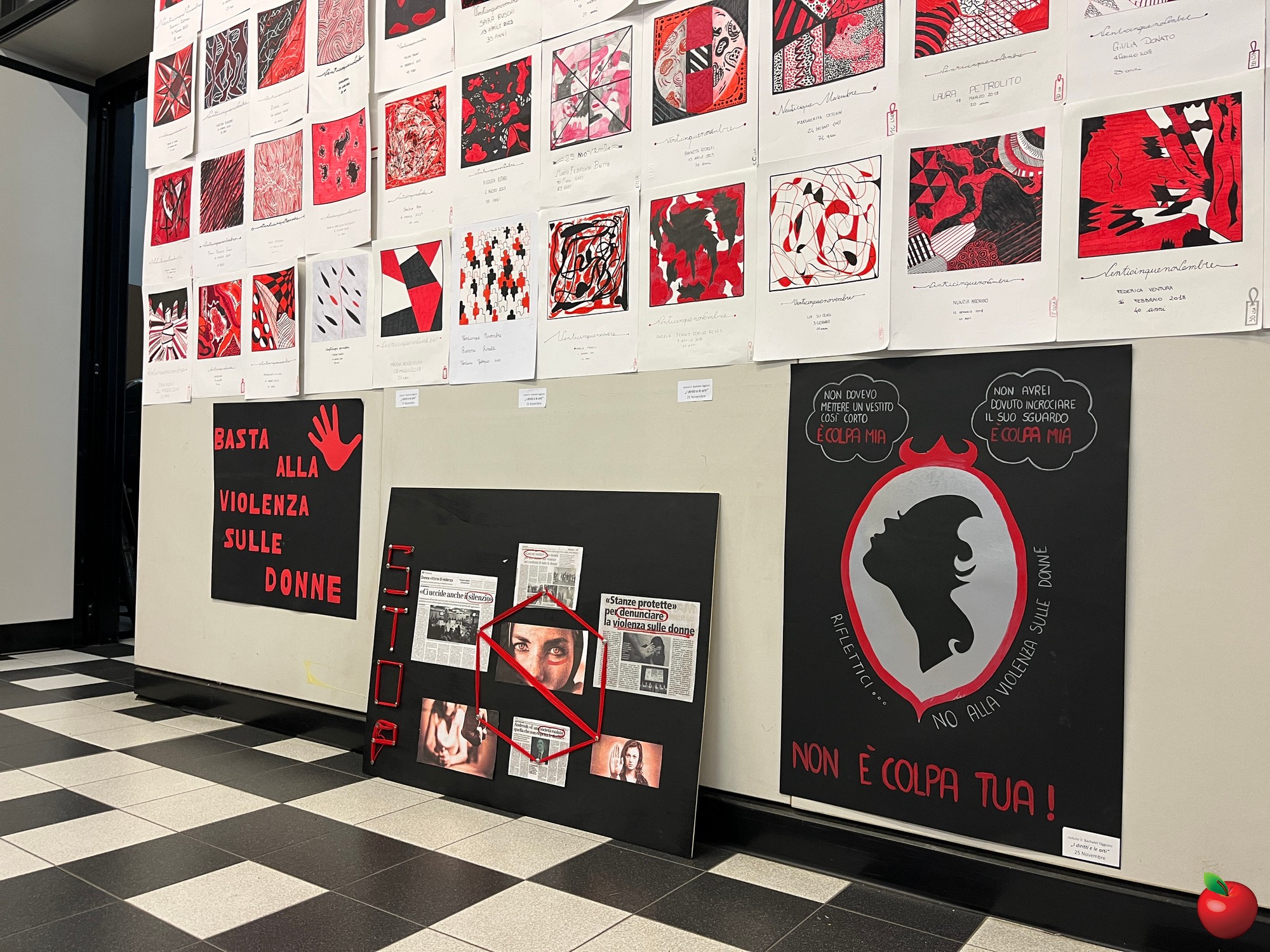 Quest'anno il corpo docente di arte ha scelto un approccio raffinato e simbolico, ispirandosi alla fotografa Lee Miller. Il formato polaroid delle opere all’ingresso accoglie i visitatori in un percorso dominato dal nero, bianco e rosso. "Abbiamo puntato sull'astratto per evitare delle immagini che fossero specificatamente ad una violenza esplicita", spiegano gli insegnanti.