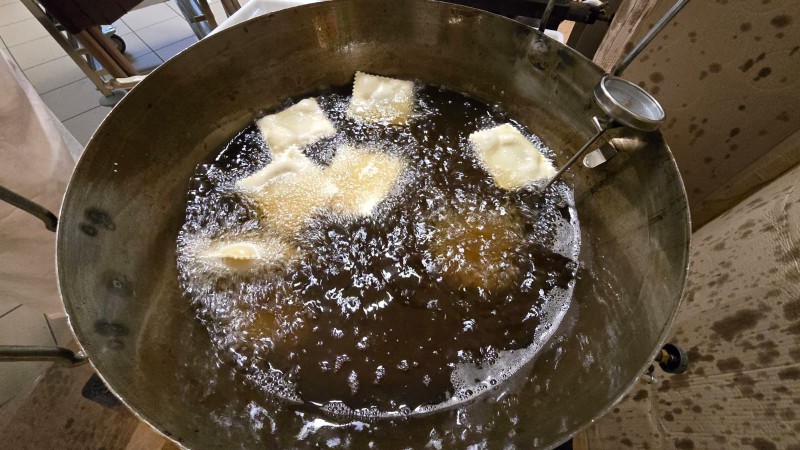 I ravioli vengono completamente preparati dal gruppo, a partire dalla realizzazione dell’impasto, il quale viene tirato e tagliato nella forma corretta. Dopo averlo lasciato asciugare, viene farcito con i due tipici ripieni: panettone di San Biagio e marmellata oppure una farcitura al cioccolato dalla consistenza e dal sapore simili alla torta paesana. La friggitura rende i ravioli dorati e croccanti, mentre la spolverata di zucchero a velo successiva li rende ancora più appetitosi e invitanti.