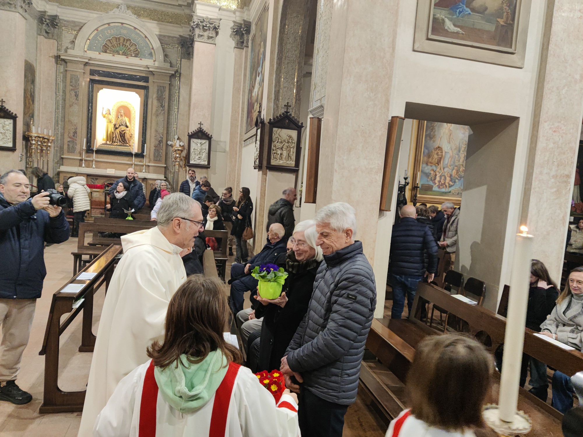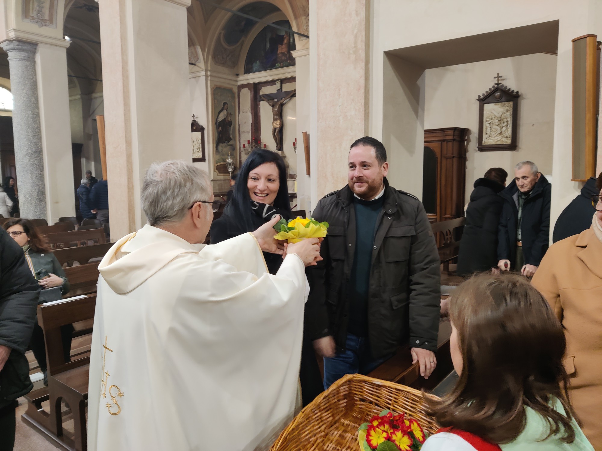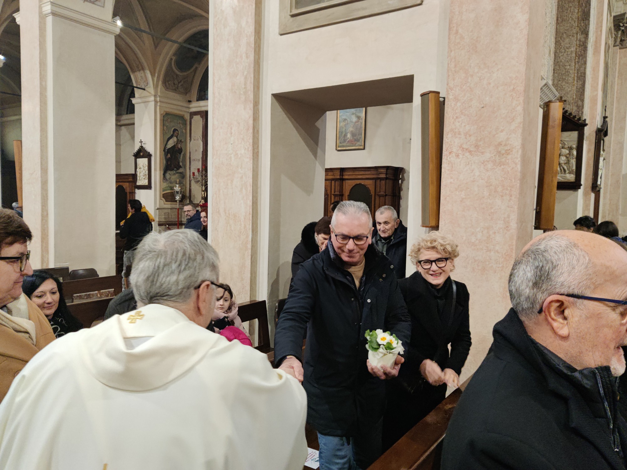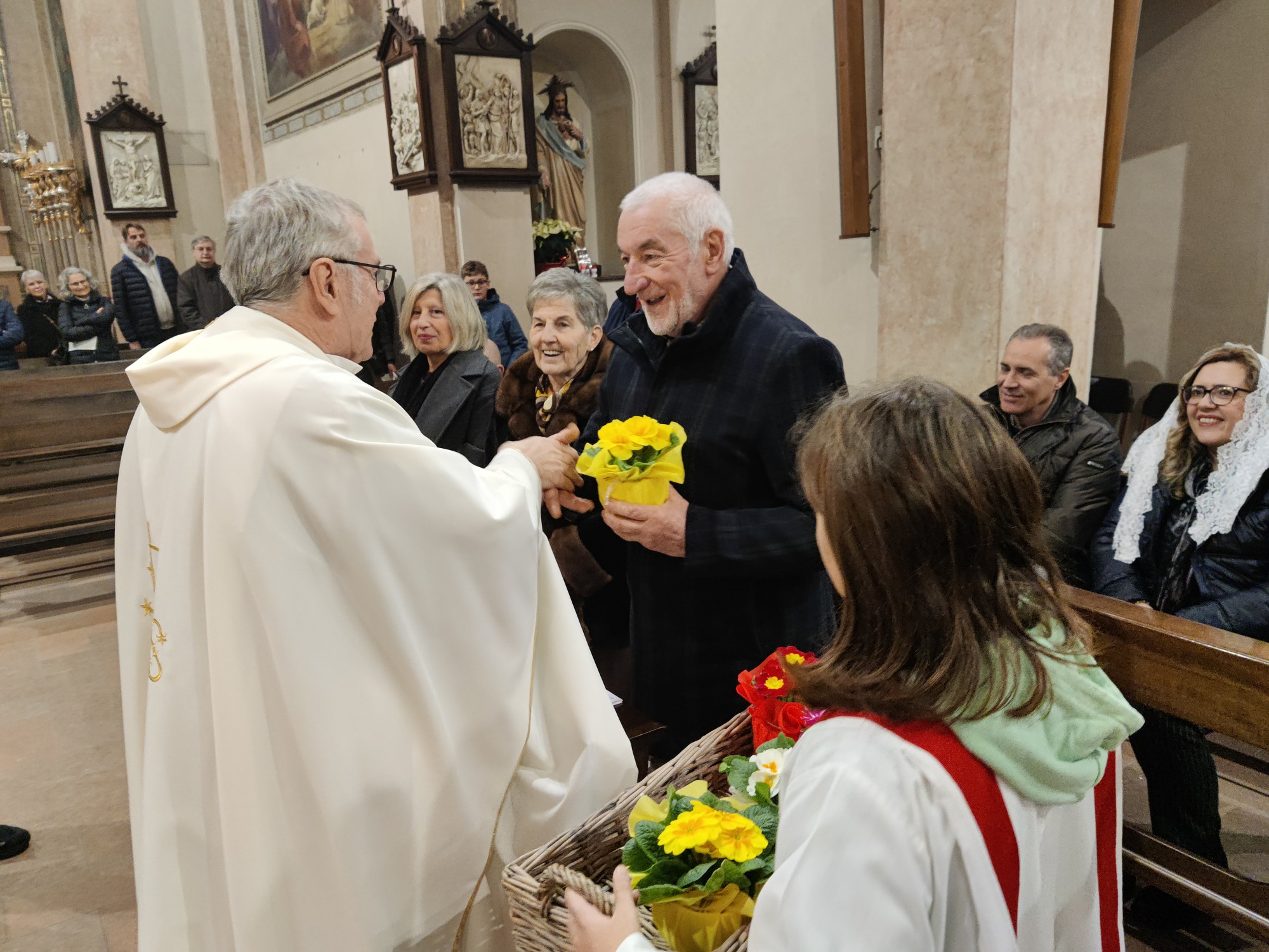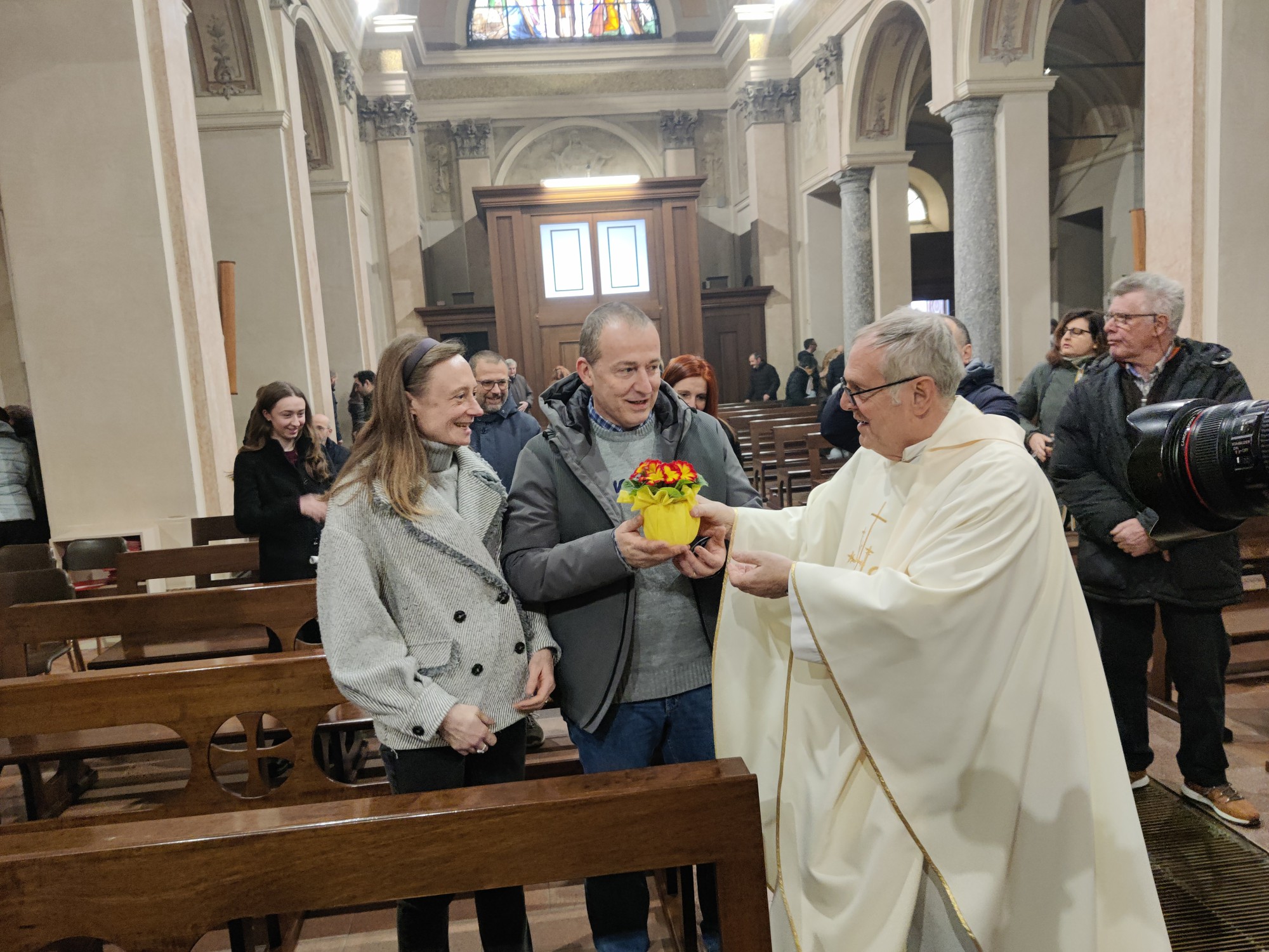 A conclusione della celebrazione il parroco si è recato da ogni coppia per consegnare un omaggio floreale, simbolo di amore e di cura verso il prossimo.