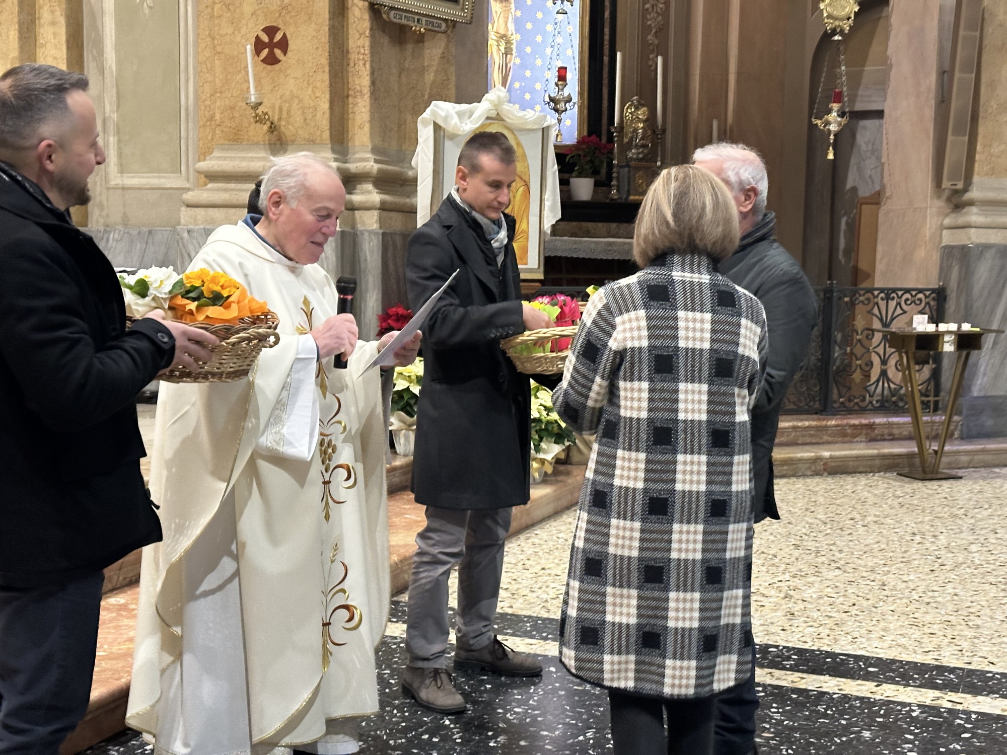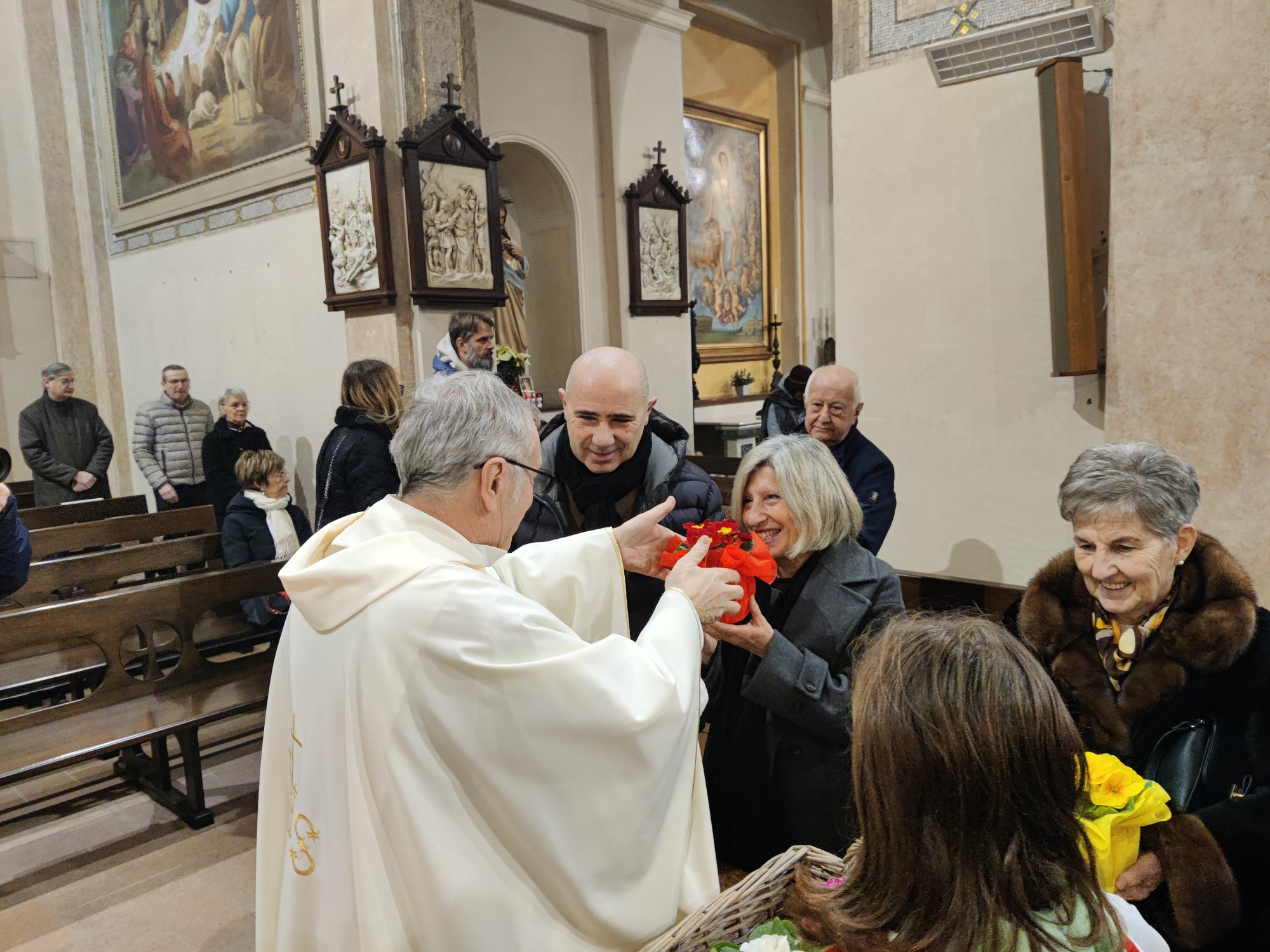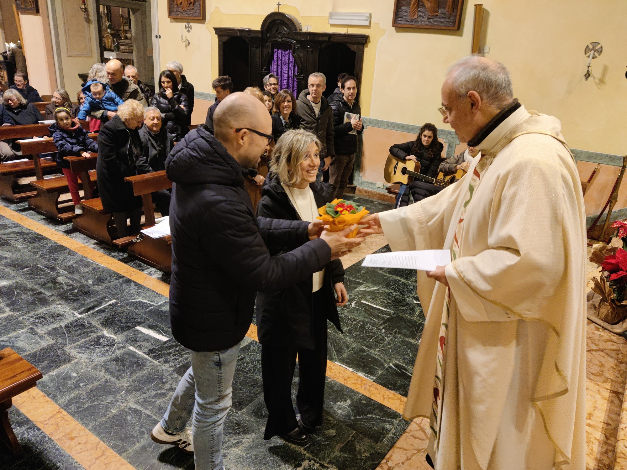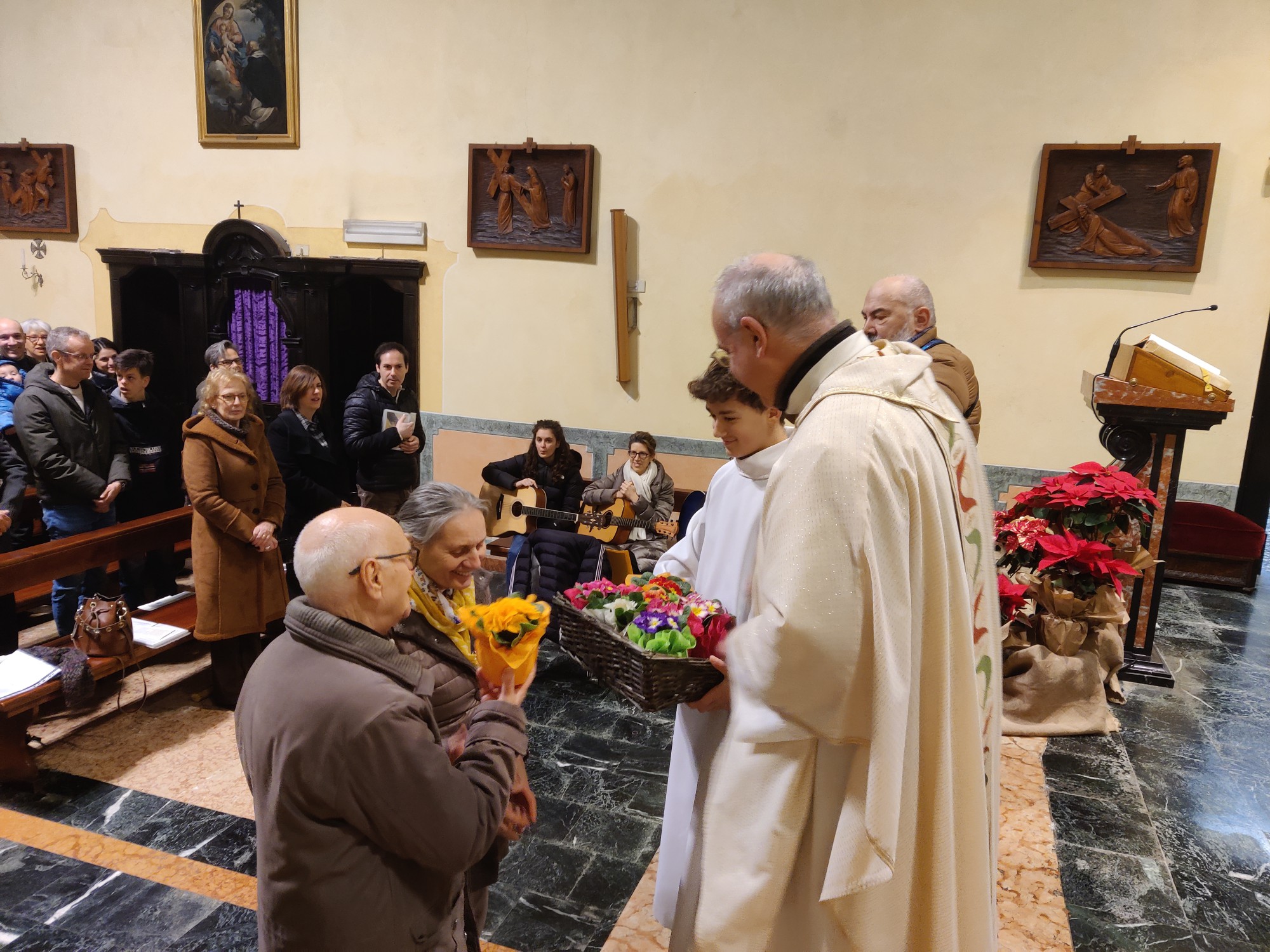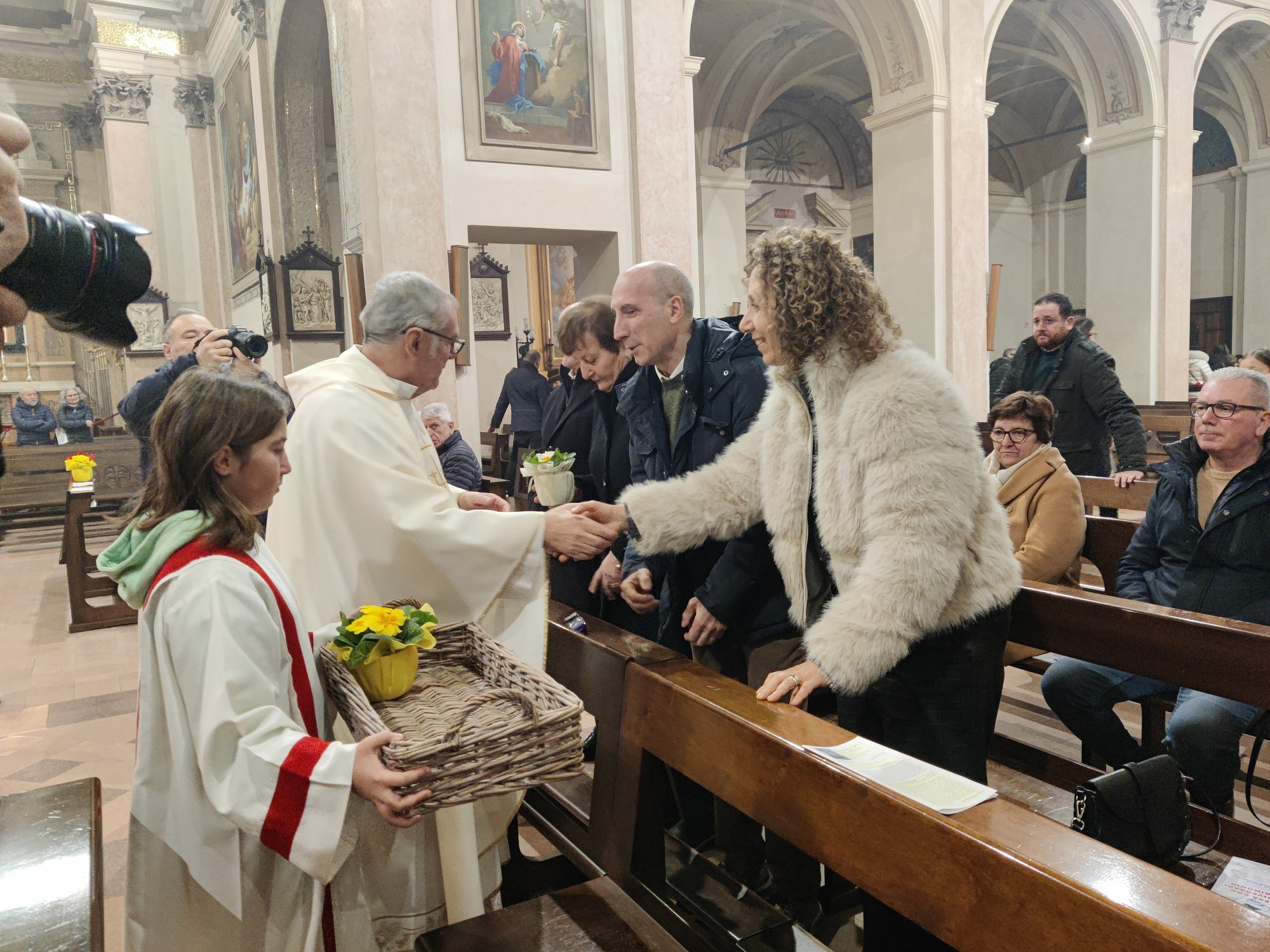 A conclusione della celebrazione il parroco si è recato da ogni coppia per consegnare un omaggio floreale, simbolo di amore e di cura verso il prossimo.