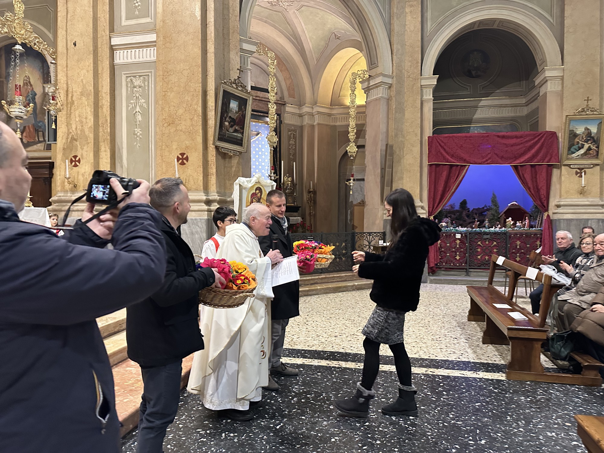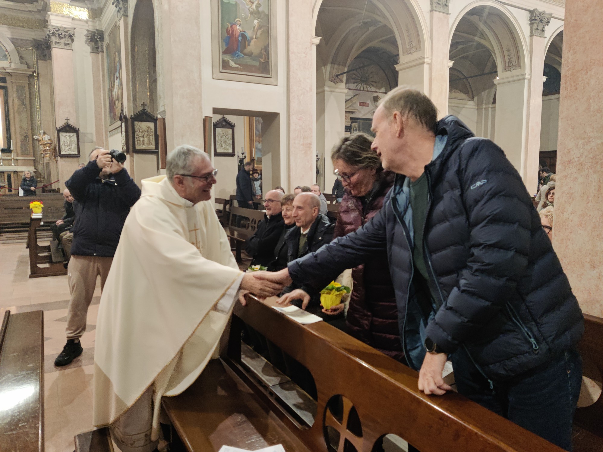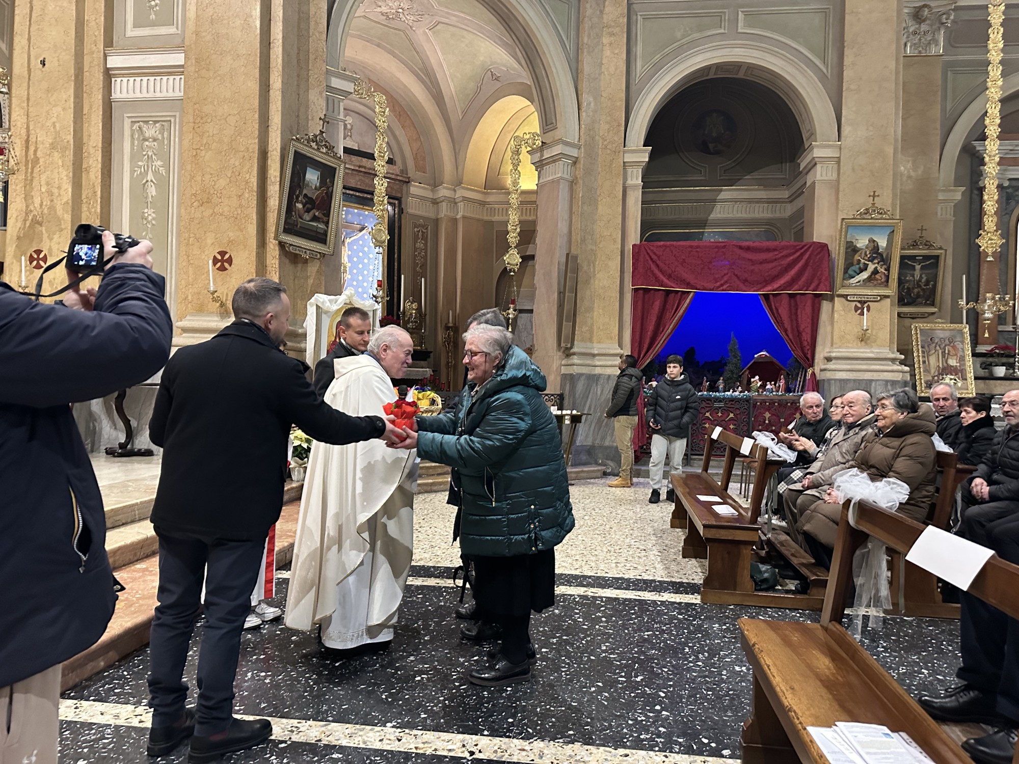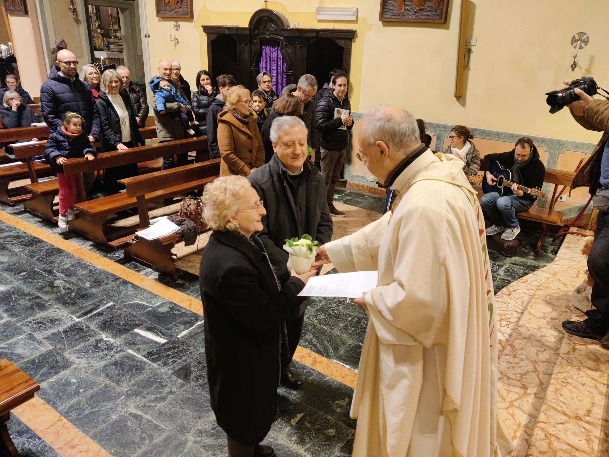 A conclusione della celebrazione il parroco si è recato da ogni coppia per consegnare un omaggio floreale, simbolo di amore e di cura verso il prossimo.