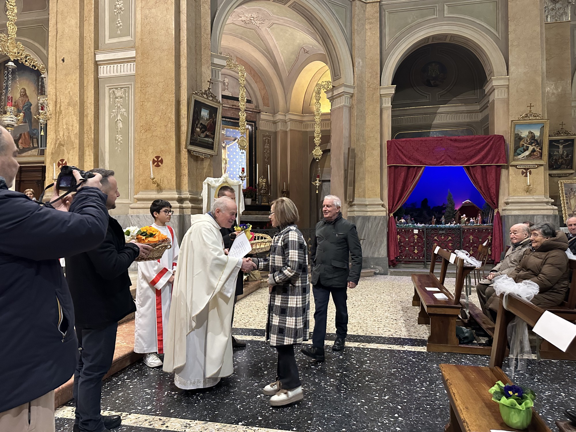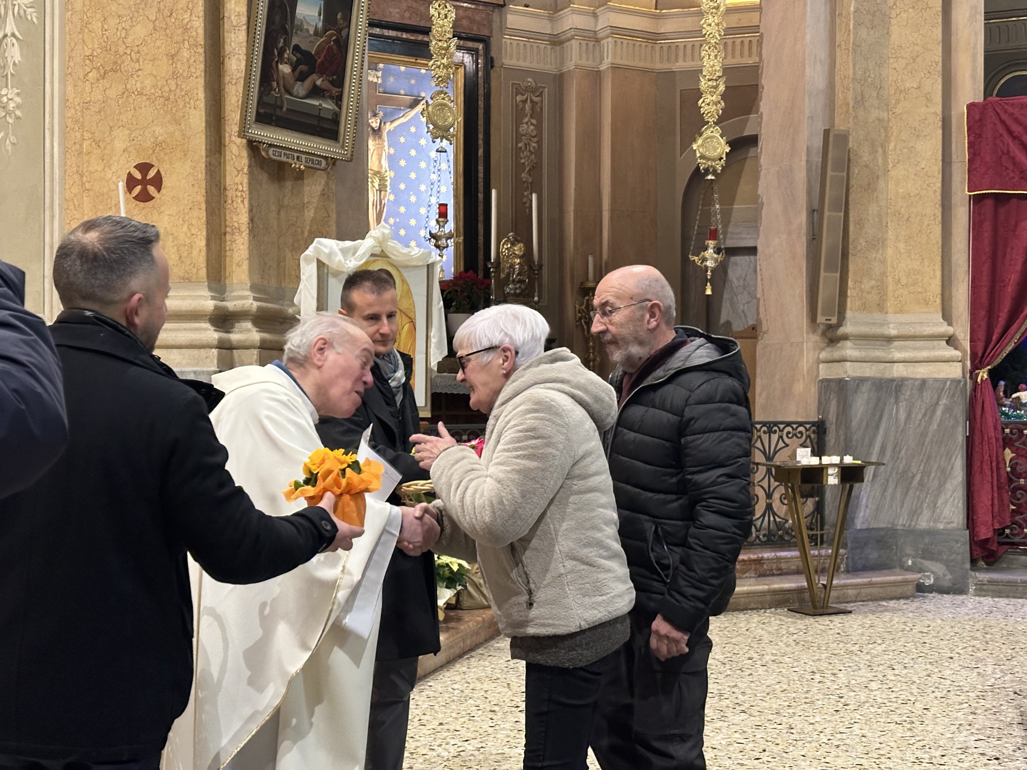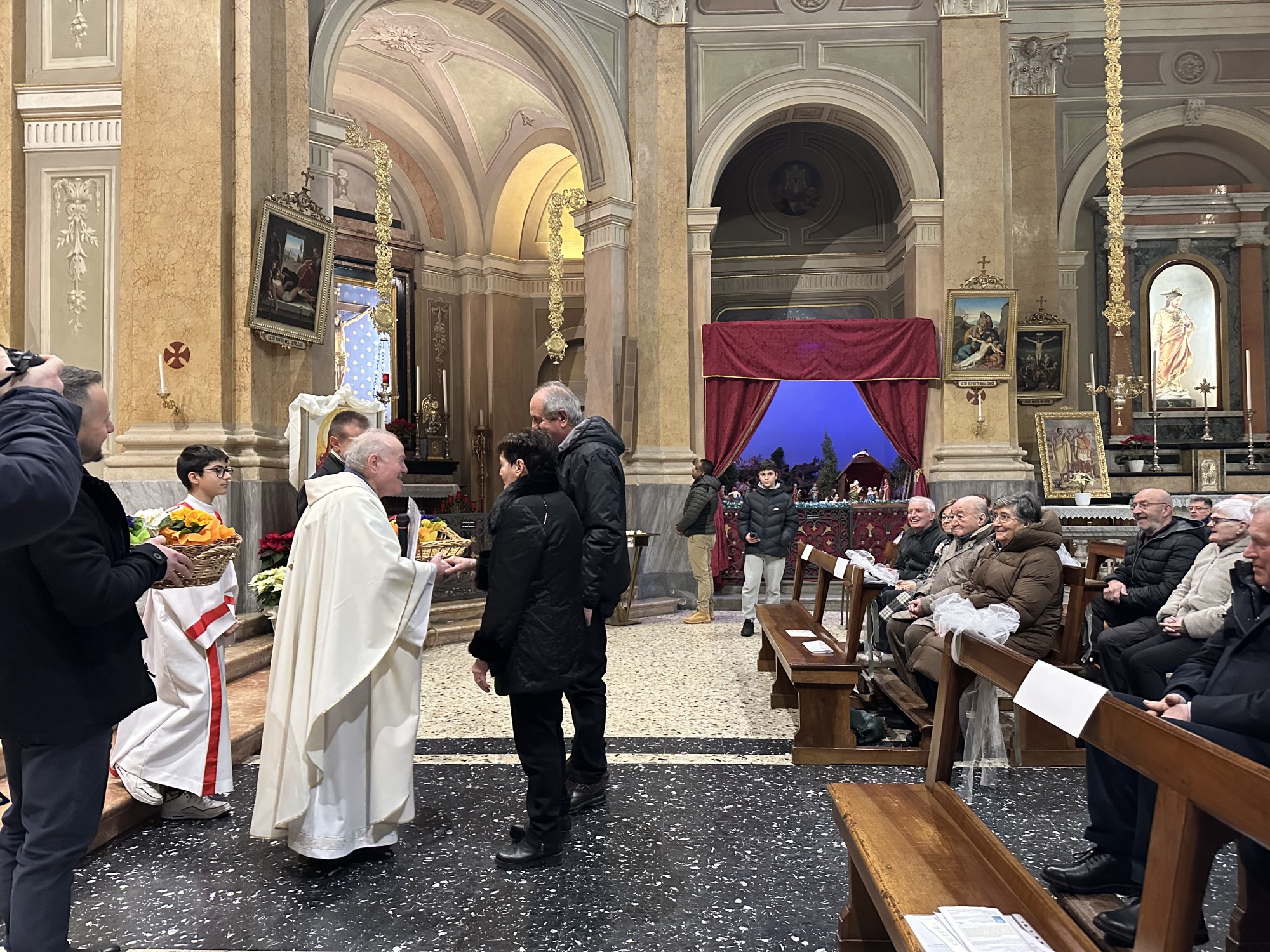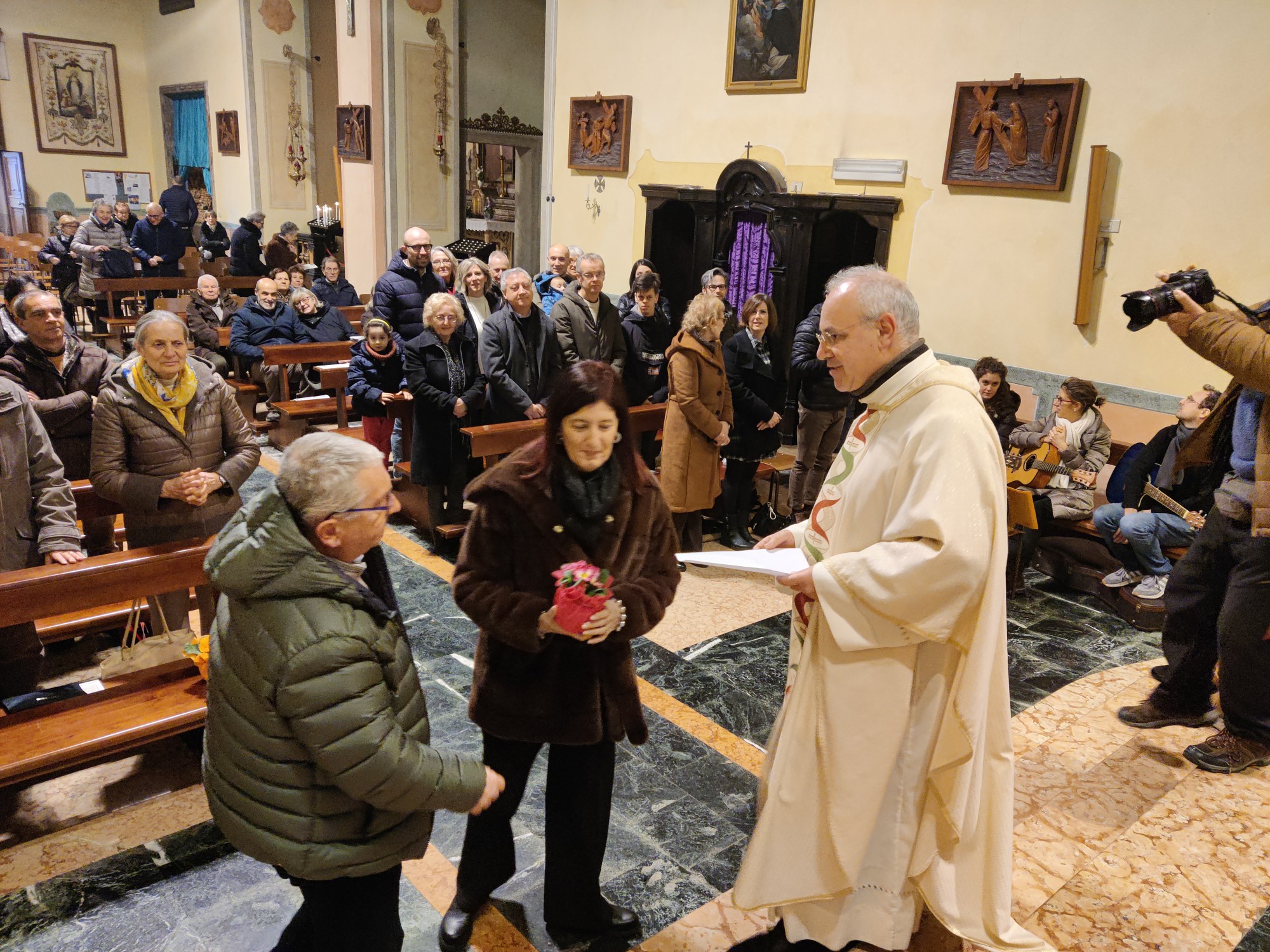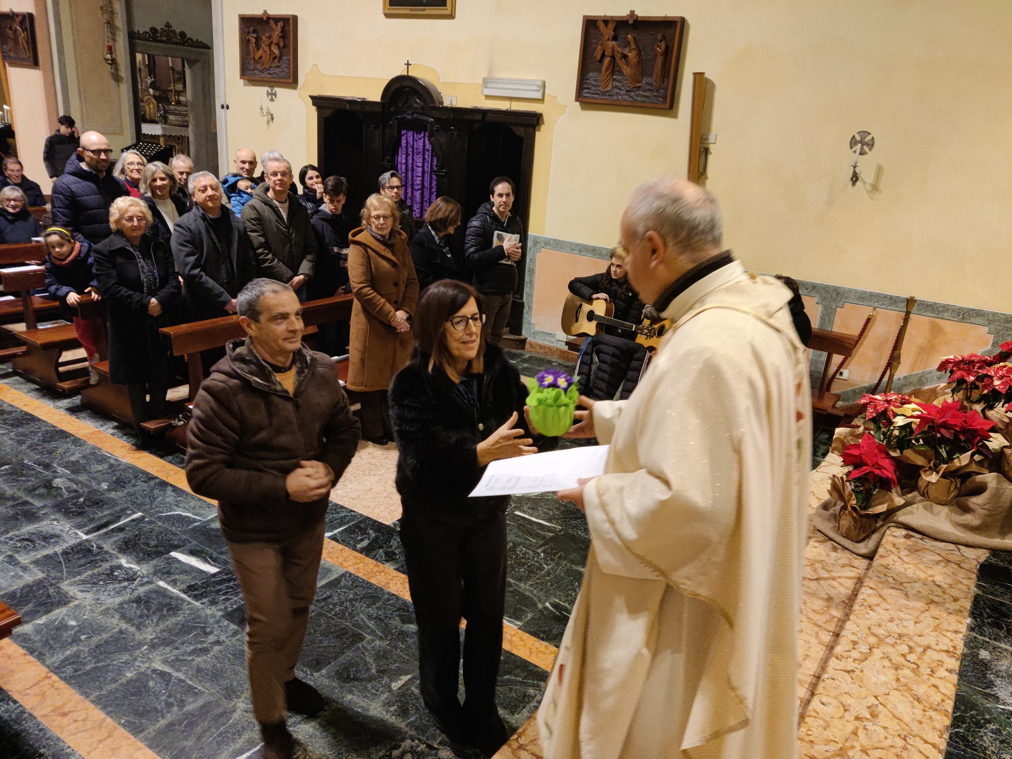 A conclusione della celebrazione il parroco si è recato da ogni coppia per consegnare un omaggio floreale, simbolo di amore e di cura verso il prossimo.
