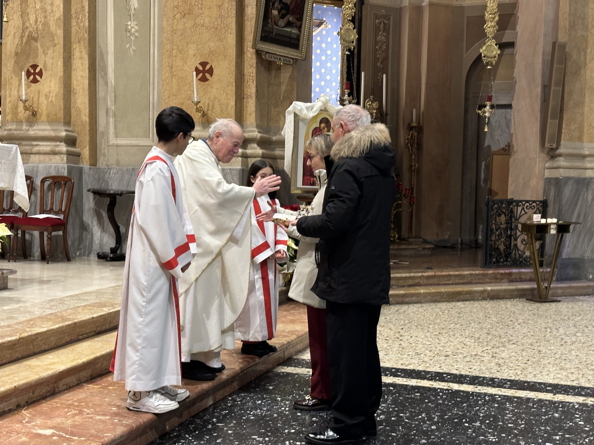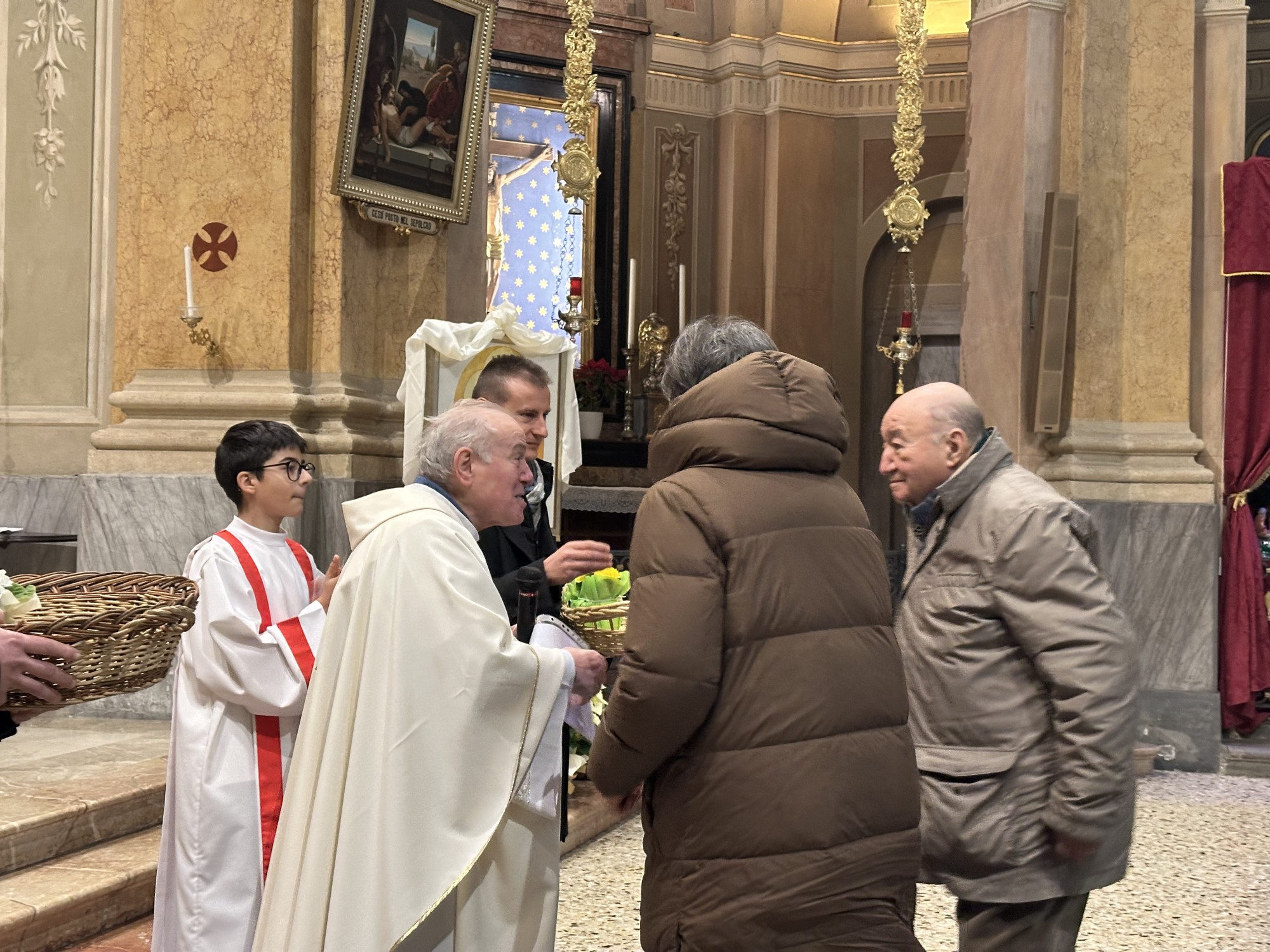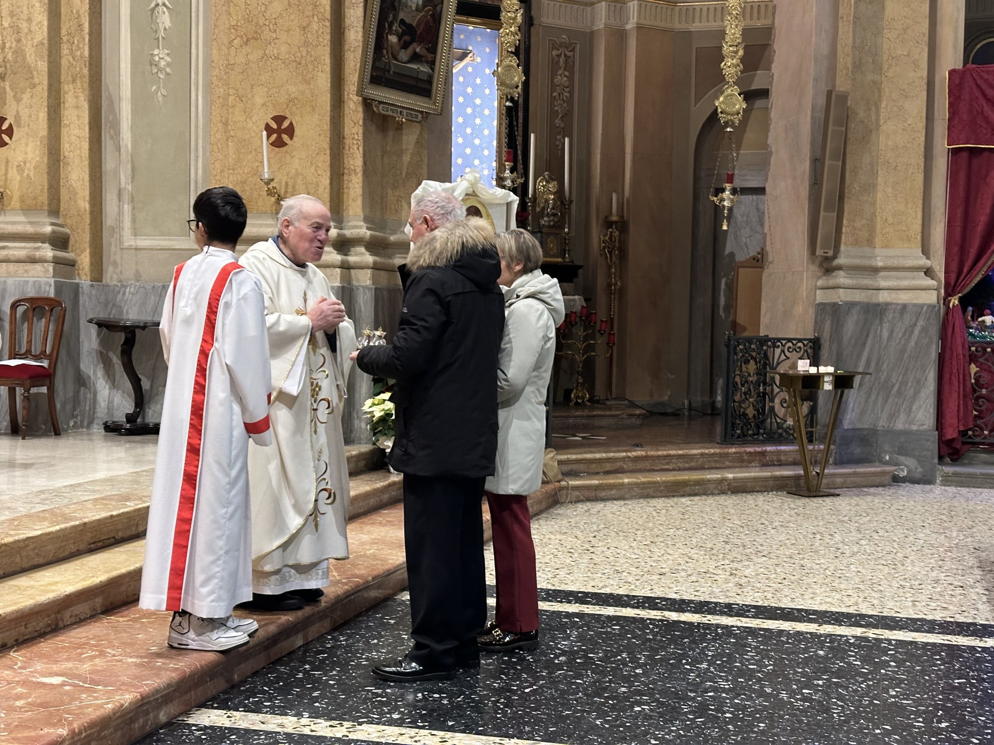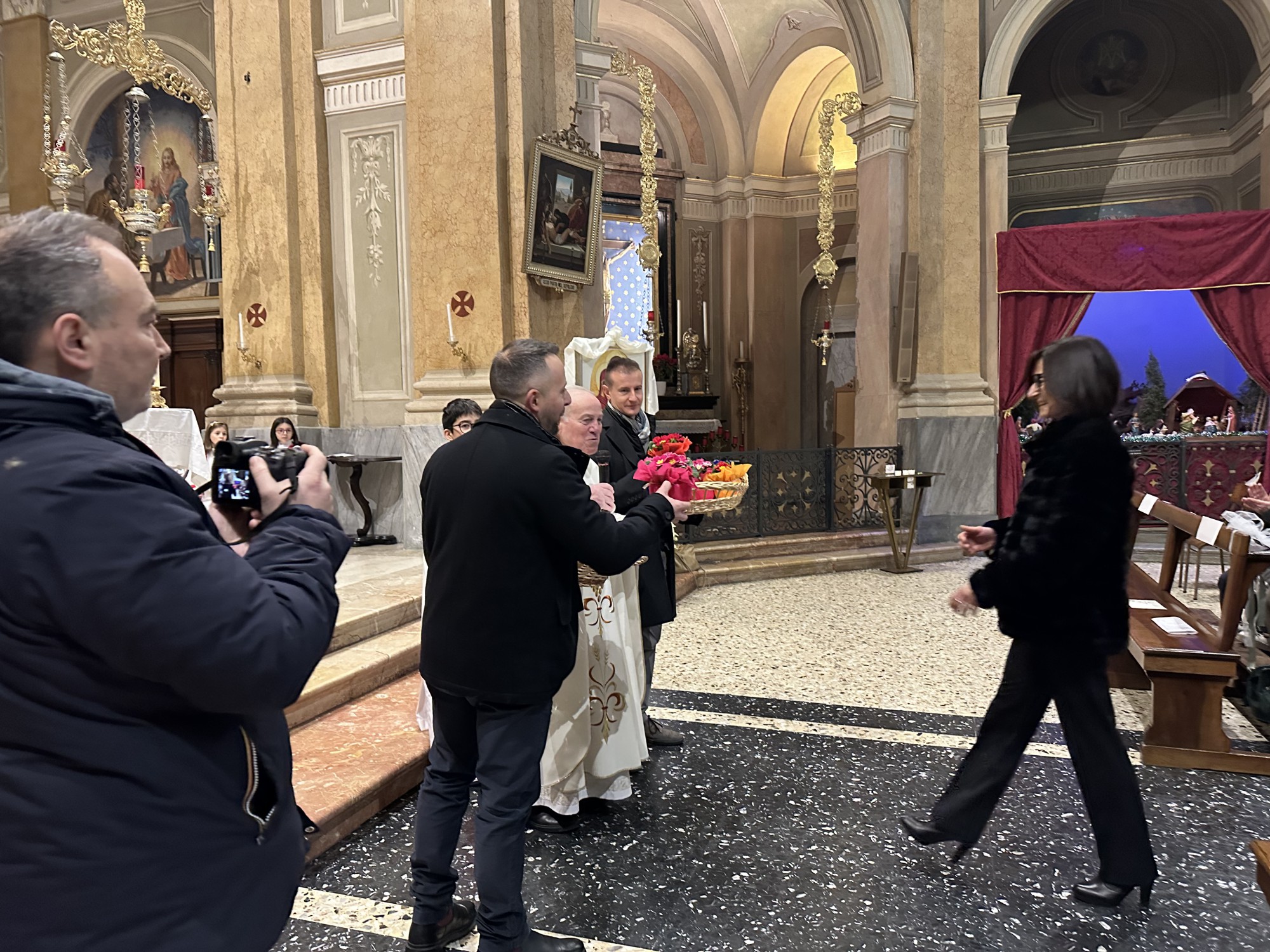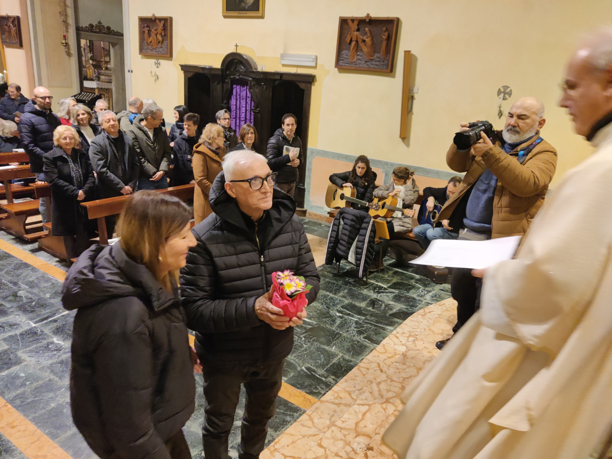 A conclusione della celebrazione il parroco si è recato da ogni coppia per consegnare un omaggio floreale, simbolo di amore e di cura verso il prossimo.