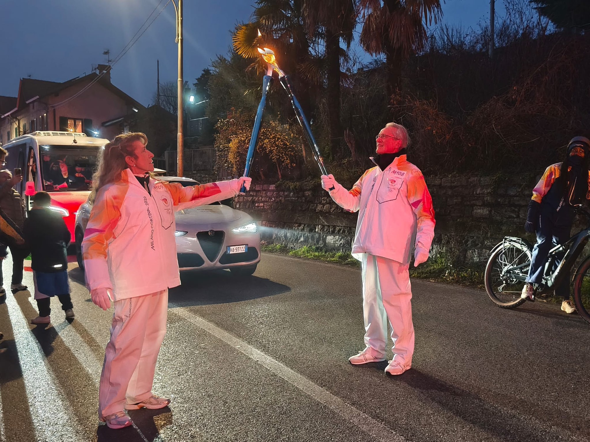 La moglie Tiziana Fumagalli attendeva il convoglio poco dopo, era carica di emozione ed è stata subito accolta dal folto pubblico a bordo strada. Abitanti di Abbadia Lariana e non, bambini, adulti, persone di tutte le età si sono avvicinate a lei curiosi della sua storia e per scattare qualche fotografia di ricordo. La sera del piccolo paese si è illuminata con l’arrivo della fiamma portata dal marito Carlo che l’ha passata alla moglie con il caratteristico ''torch kiss''.