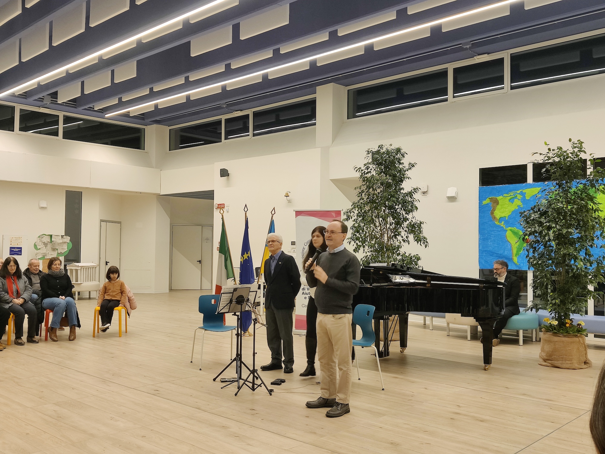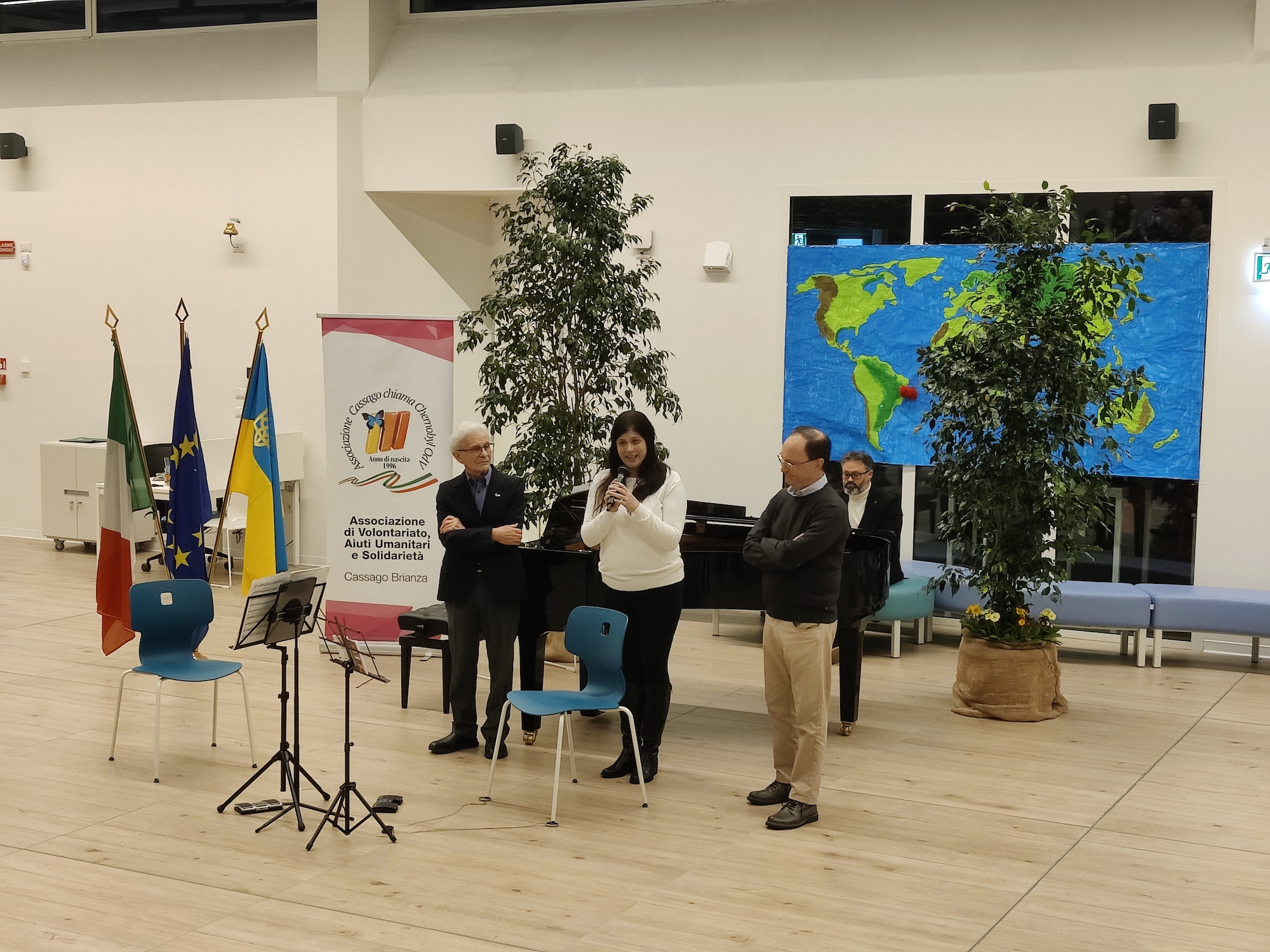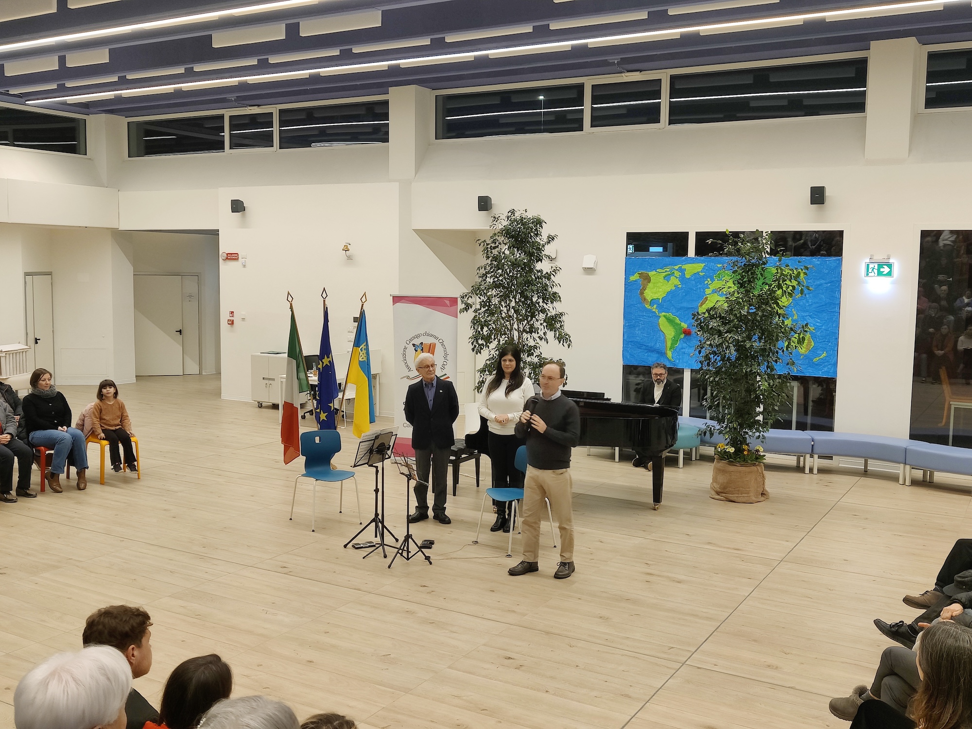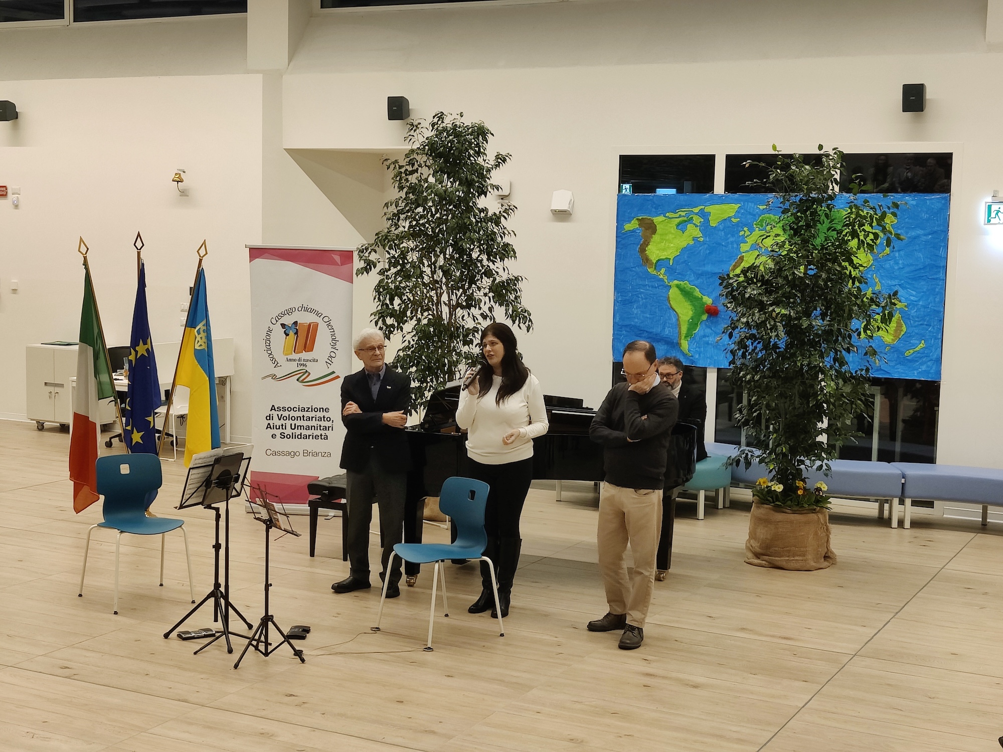 La serata, in quanto organizzata in collaborazione e con il patrocinio del Comune, è stata inaugurata dal sindaco Luca Cattaneo, il quale ha ribadito l’importanza dell’appoggio reciproco tra Cassago chiama Chernobyl e il Comune e ha mostrato grande gioia nel vedere una partecipazione particolarmente numerosa. Ha poi preso la parola il vicesindaco con delega alla cultura Raffaella Puricelli: ''Tra voi ci sono molte persone ucraine che, sebbene siano qui oggi, immagino sopportino una grande sofferenza pensando alla propria terra martoriata; ci sono anche molti italiani che vorrebbero che quello che è successo e che sta accadendo tutt’ora smettesse immediatamente. Noi nel nostro piccolo possiamo invocare la pace ed essere migliori nella nostra quotidianità, anche creando reti e connessioni con le associazioni sul territorio''.