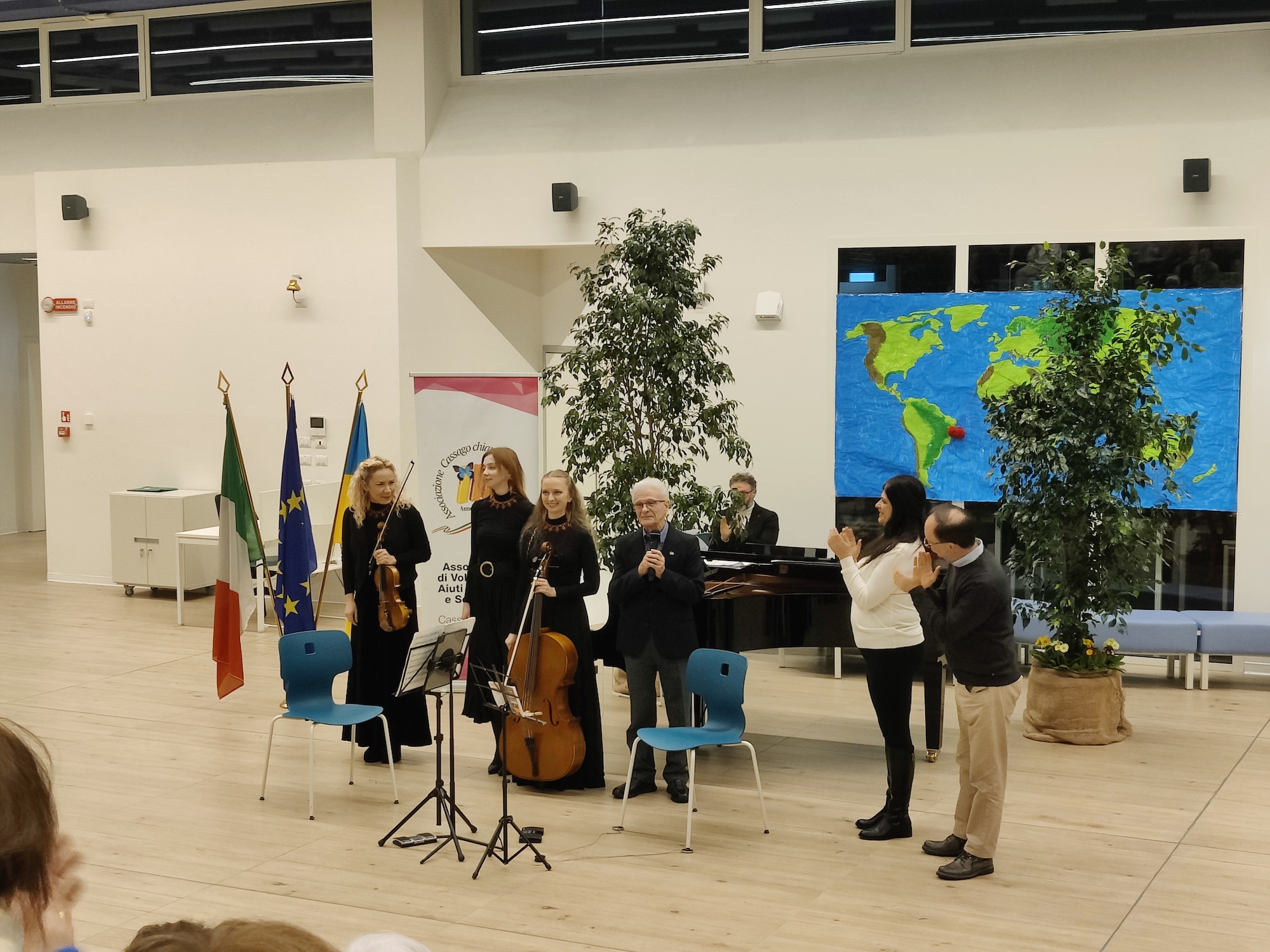 A seguito di un prezioso minuto di silenzio in ricordo di tutte le vittime della guerra, è intervenuto Armando Crippa, presidente dell’associazione cassaghese: ''Tutte le iniziative che organizziamo hanno un duplice scopo, quello di continuare a dare aiuti importanti a chi ne ha bisogno e quello di non far sentire mai nessuno solo. Abbiamo sempre mostrato uno spirito forte e crediamo che, quando arrivano i nostri aiuti, i popoli in difficoltà capiscano che, al di là della guerra, c’è qualcuno che li sta sostenendo. Ringrazio le musiciste per la loro disponibilità totalmente a titolo gratuito, il Comune di Bulciago e tutti voi qui presenti, con l’aiuto dei quali sarà possibile intervenire concretamente a sostegno di una scuola ucraina''.