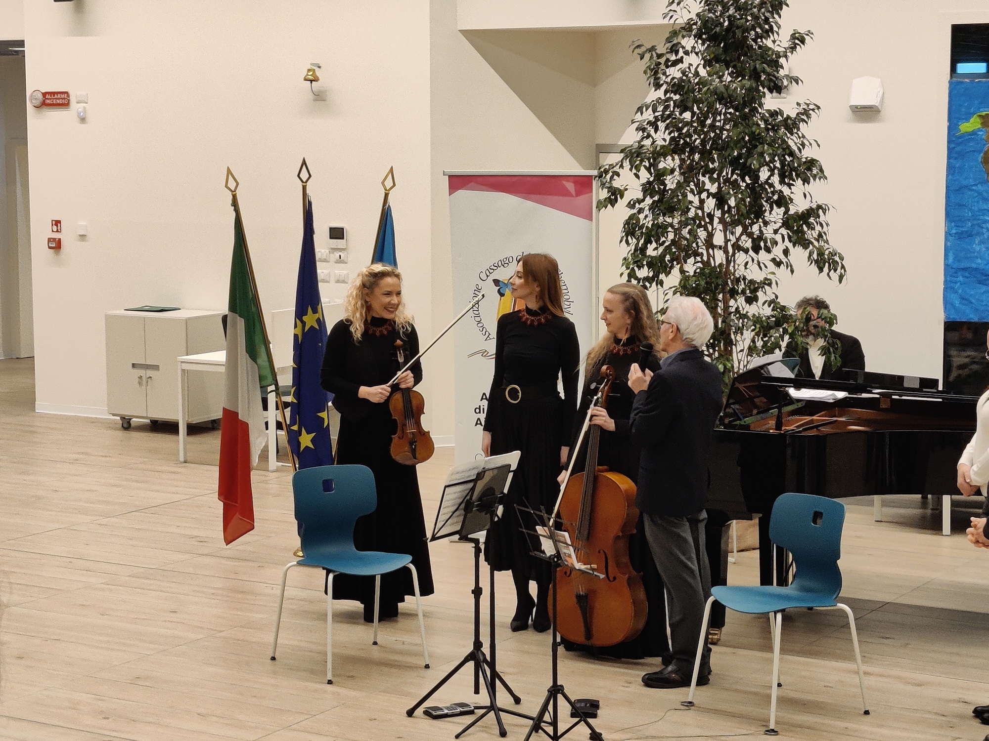 Il concerto, dal carattere classico e cameristico, ha visto come protagonista l’Ukrainian Ladies’ Piano Trio, ensemble di alto profilo artistico composto da Kateryna Poteriaieva (violino), Kateryna Bannyk (violoncello) e Anastasia Semeniuk (pianoforte). Si tratta di tre artiste di grande competenza solistica, cameristica e orchestrale, le quali hanno dato vita a un progetto musicale fondato sulla ricerca sonora in grado di guidare l’ascoltatore attraverso un’esperienza melodica intensa ed emozionante.