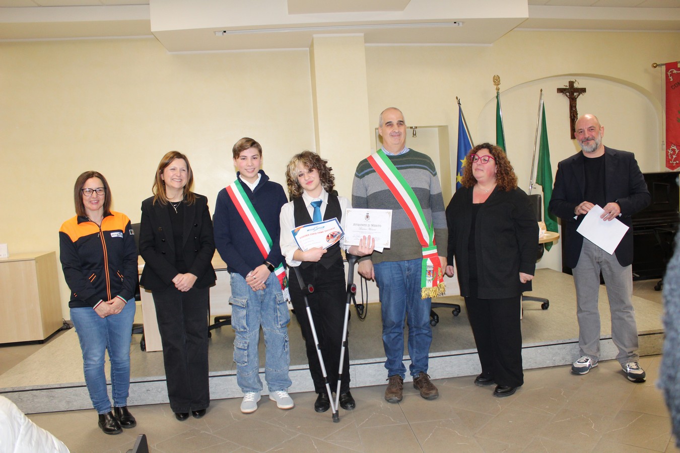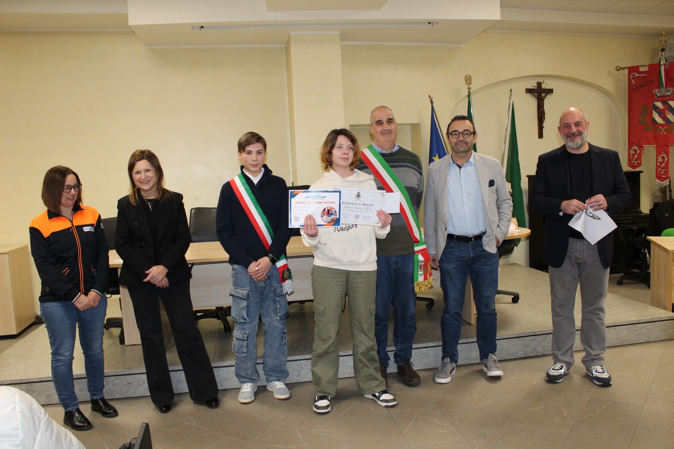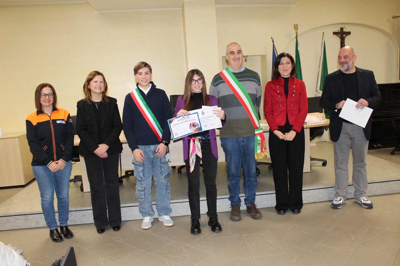 Spazio quindi alle premiazioni dei ragazzi e delle ragazze che, uno dopo l'altro, sono stati chiamati a ricevere l'attestato. A consegnarli una serie di ospiti speciali: oltre ai volontari di Croce Bianca e FuoriClasse già citati, sono intervenuti la professoressa Sabina Coladonato (referente della scuola media Leonardo da Vinci), la presidente del Consiglio di Istituto Roberta Filigura e il consigliere di minoranza Rossano Casiraghi. Quest'ultimo ha esortato i ragazzi ha coltivare la cultura, ma anche il rispetto per gli altri.