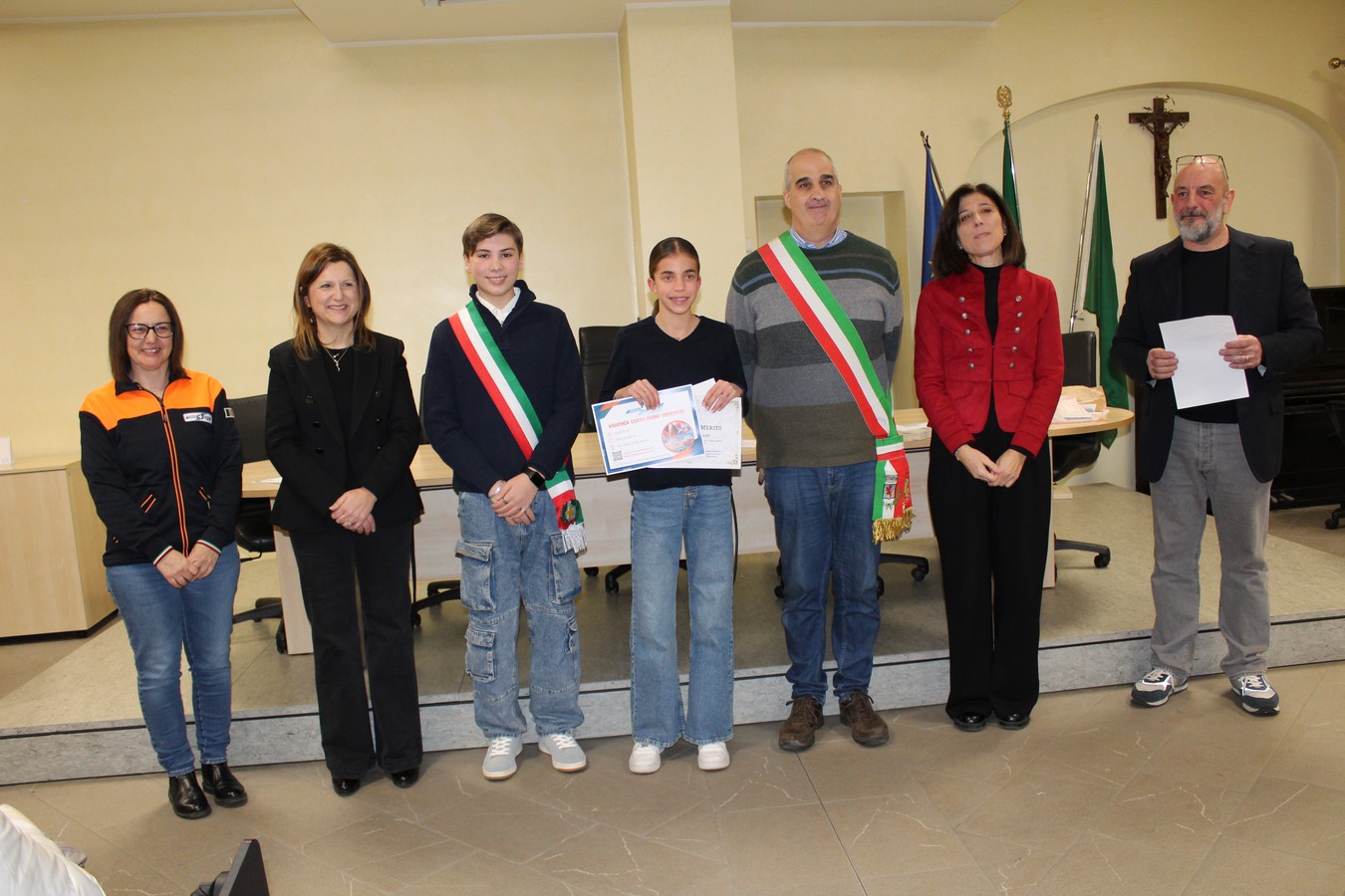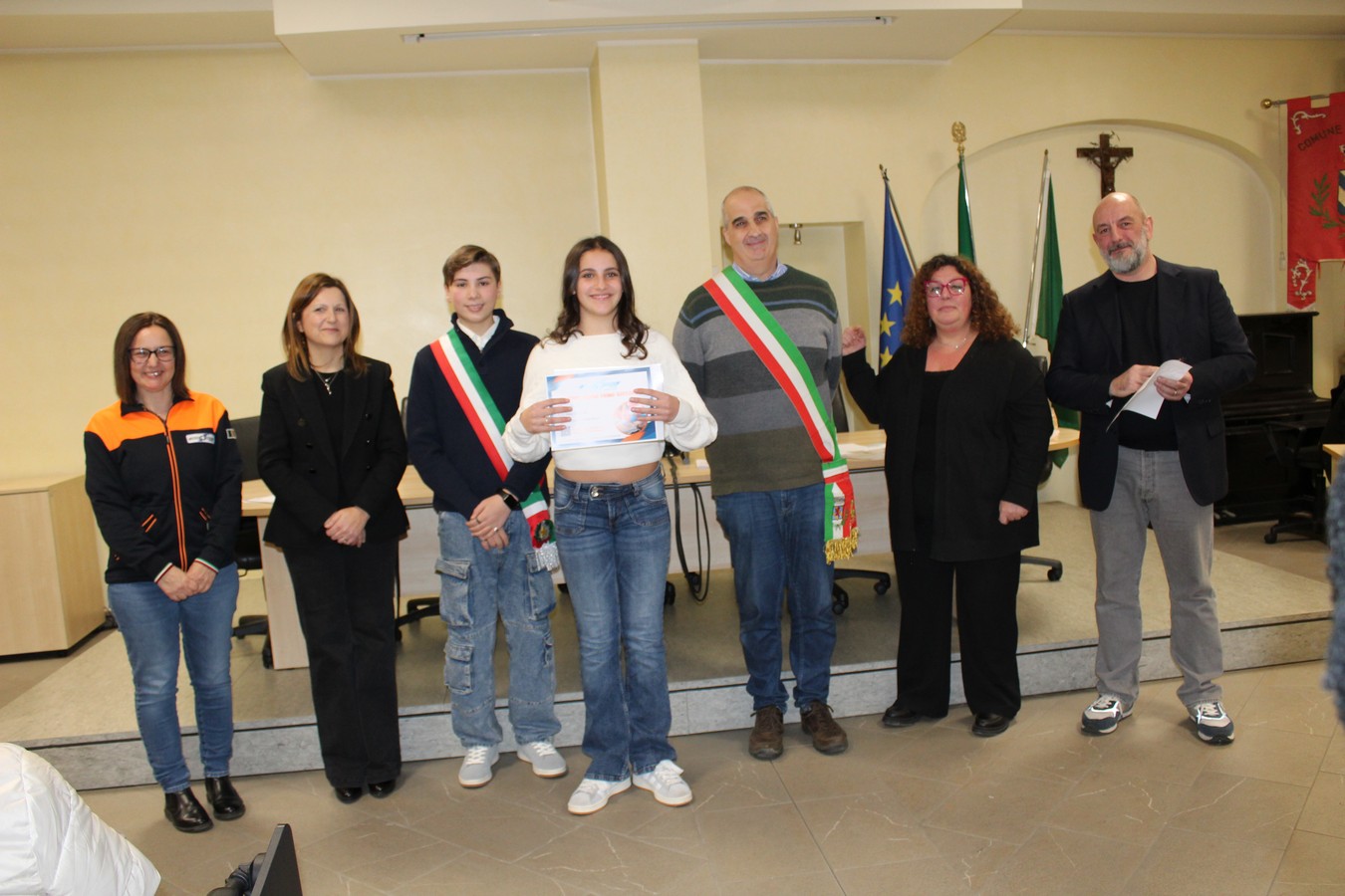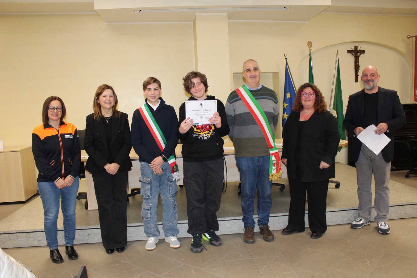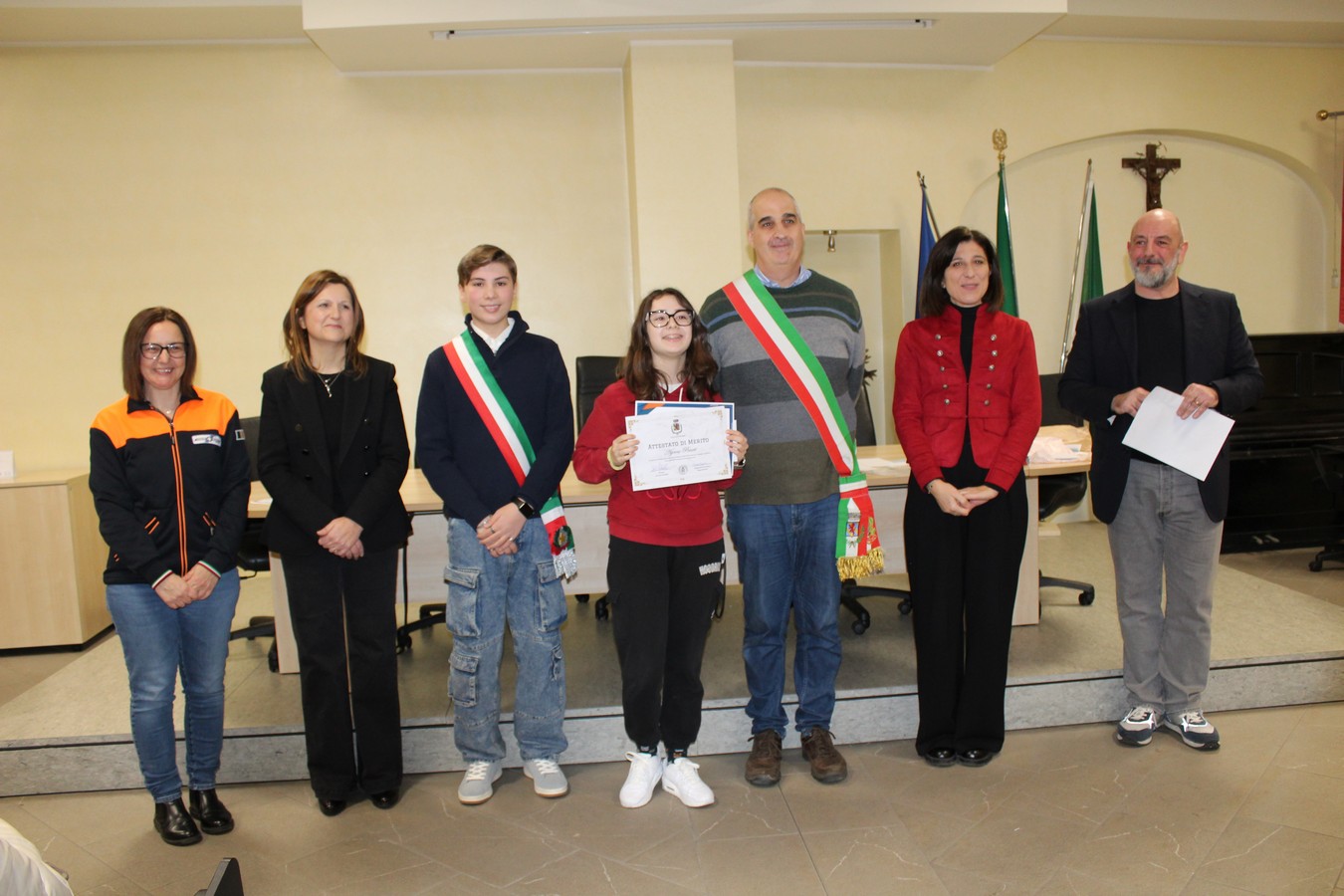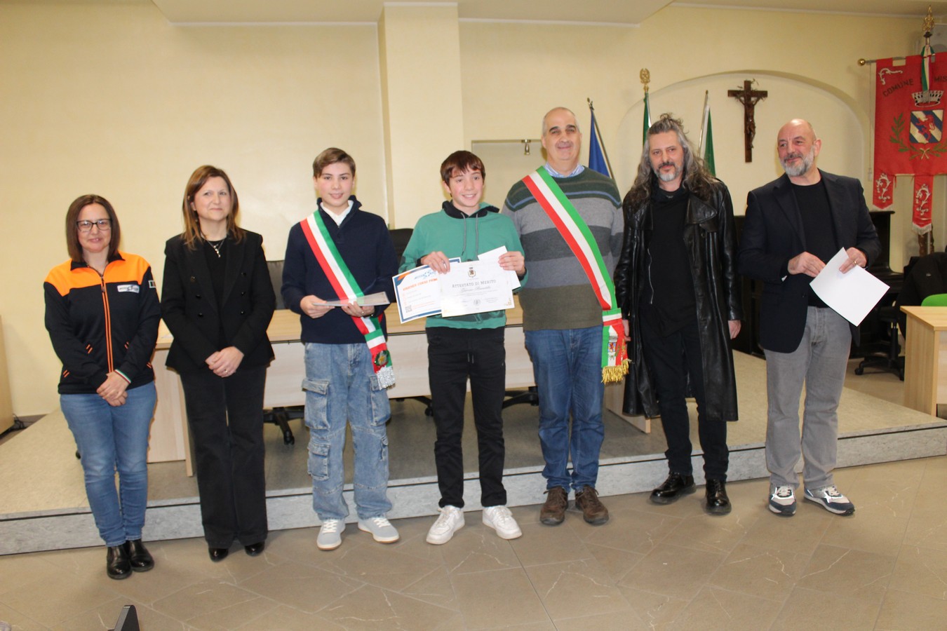 Un'immagine con i ragazzi premiati, i volontari e gli amministratori comunali