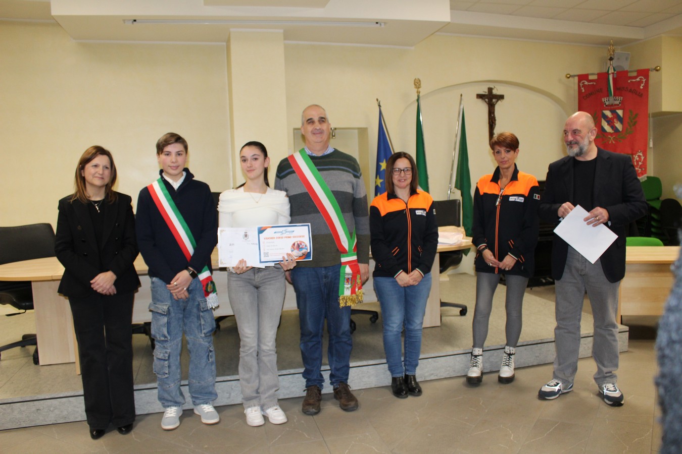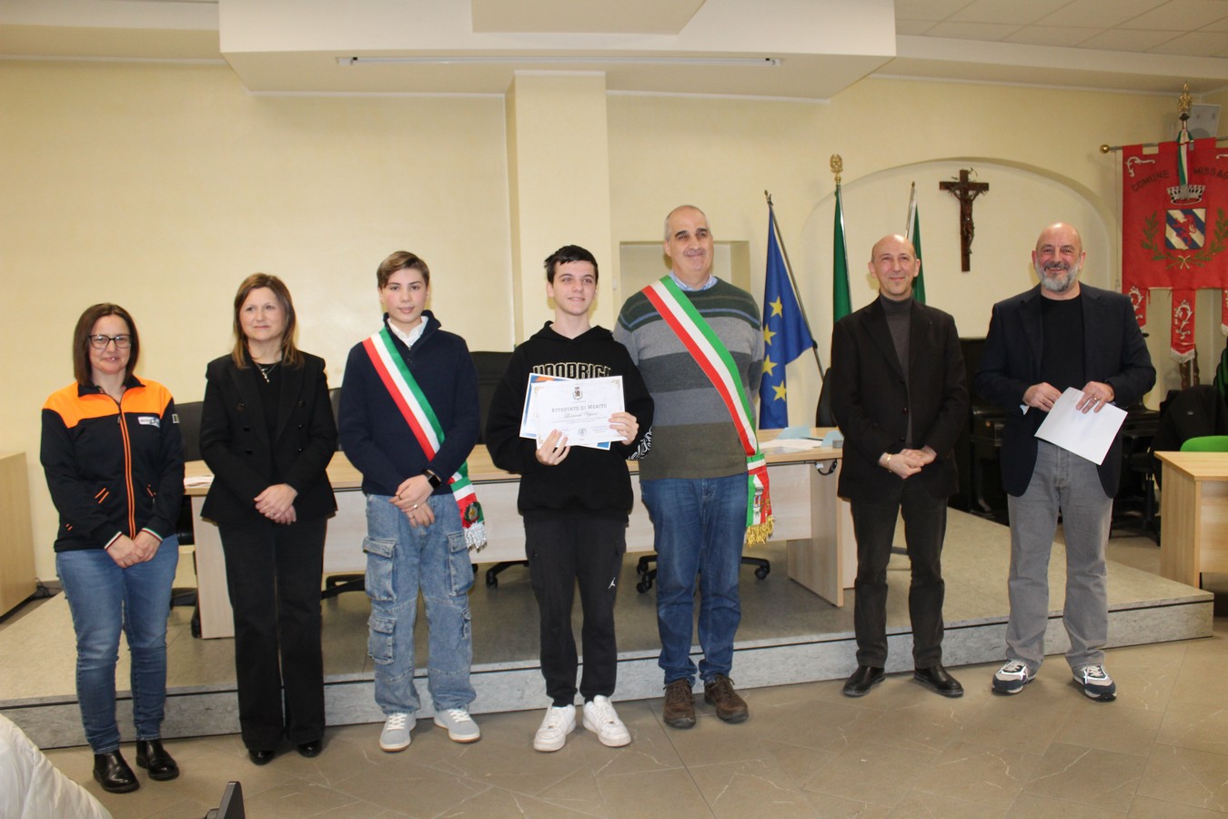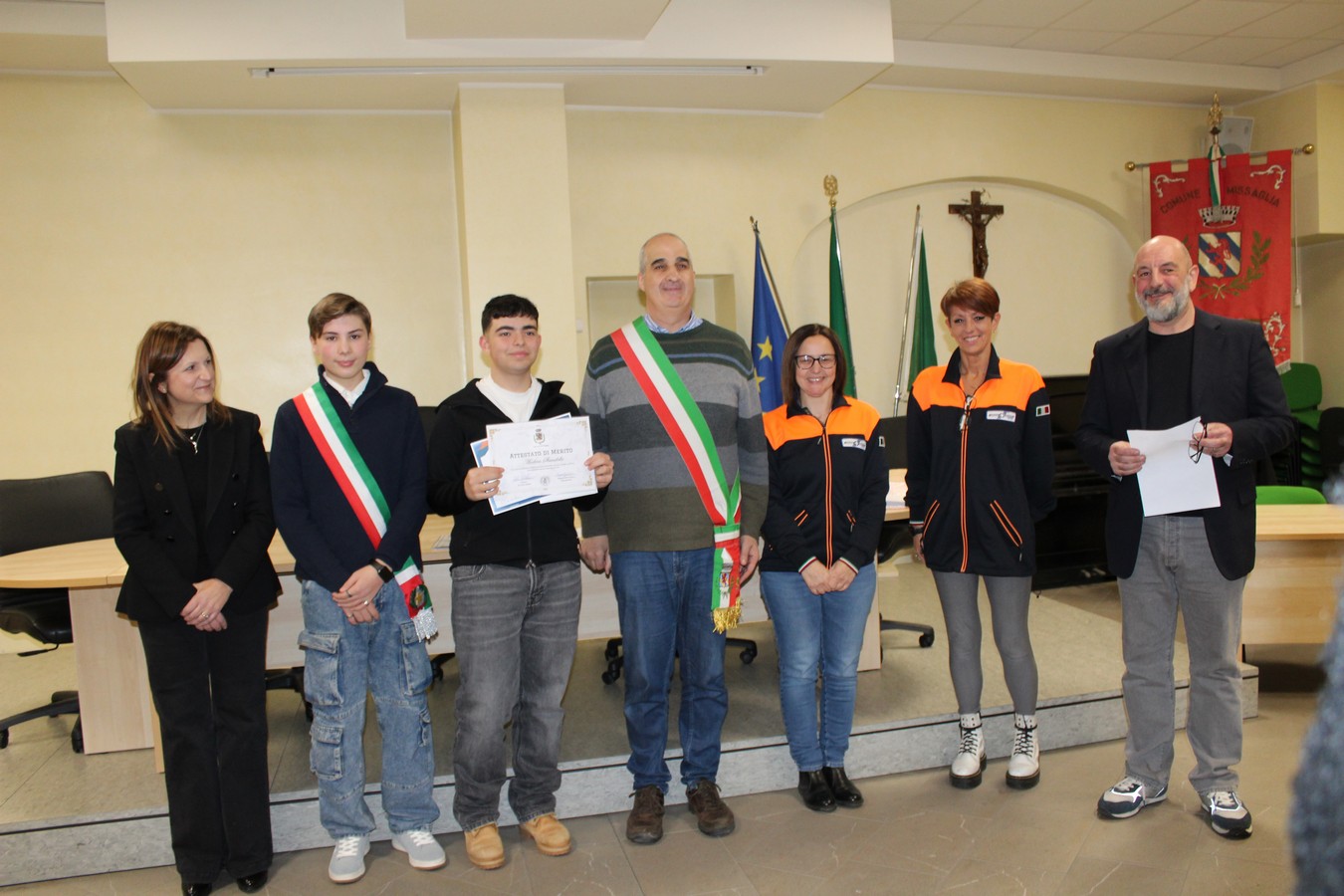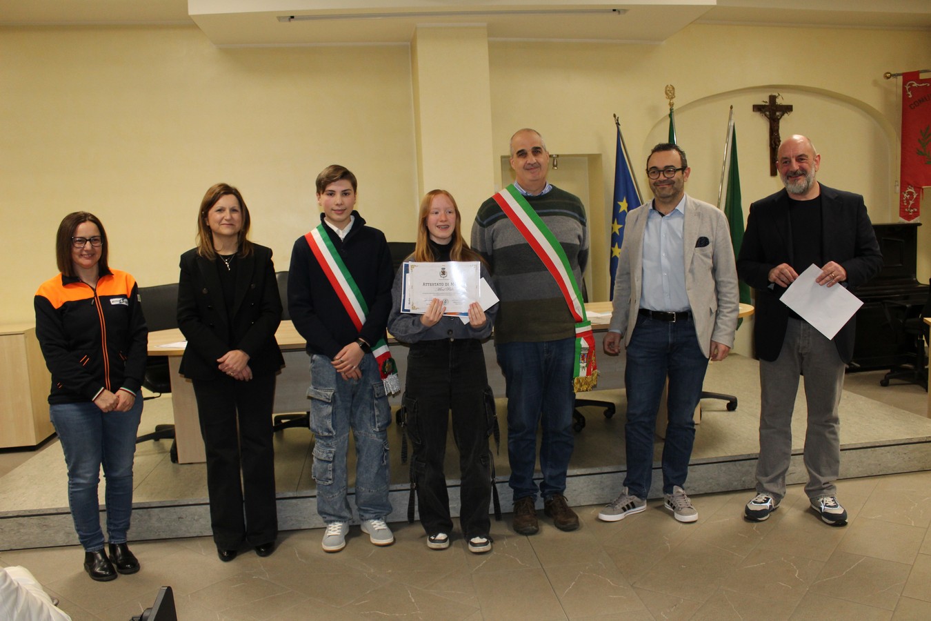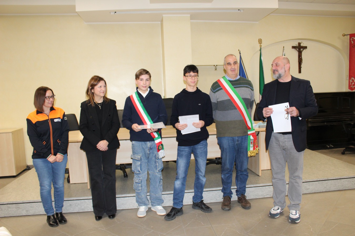 Un'immagine con i ragazzi premiati, i volontari e gli amministratori comunali