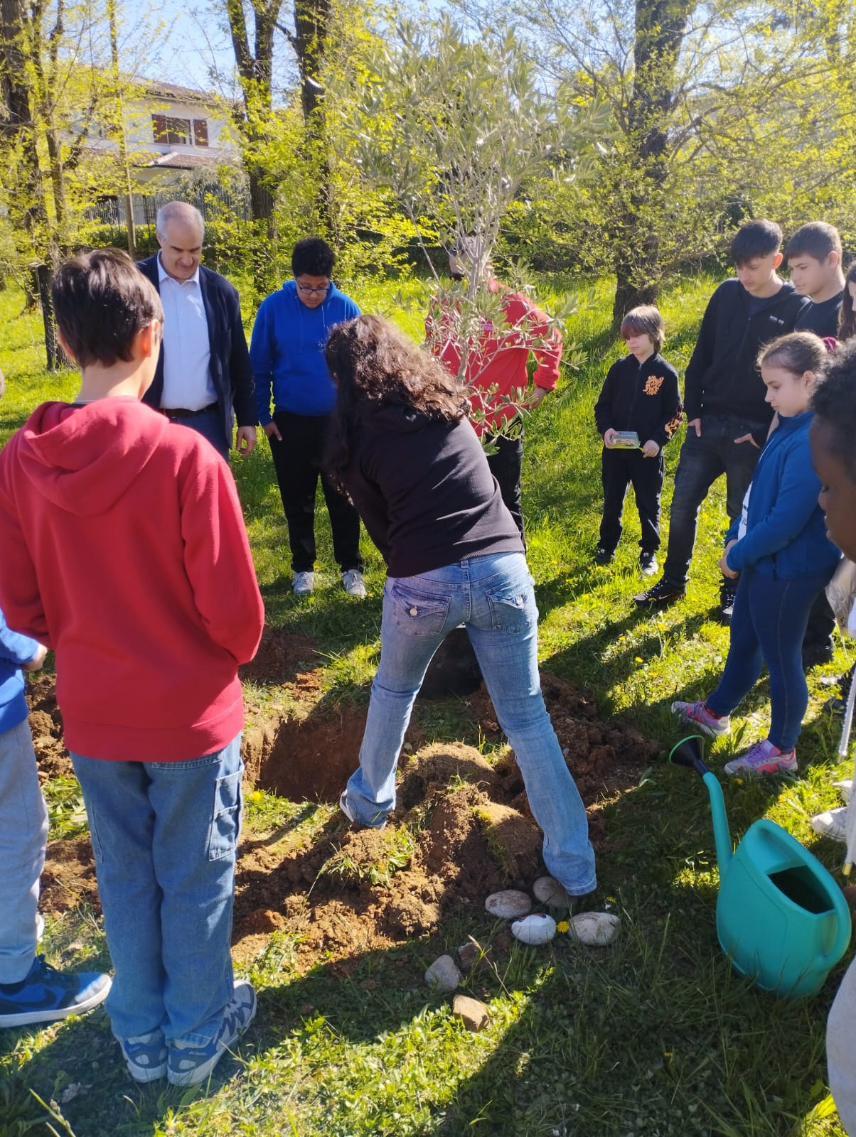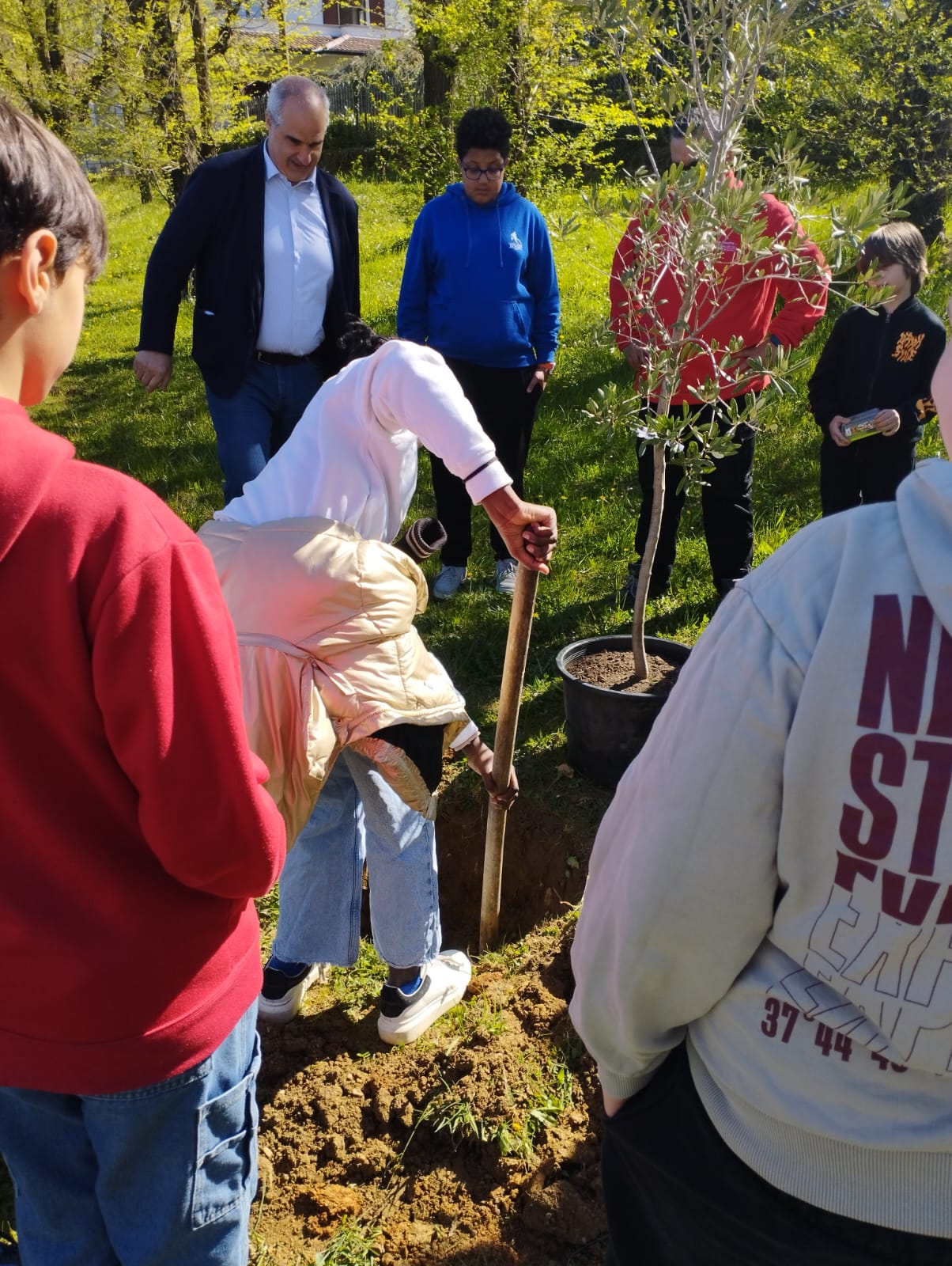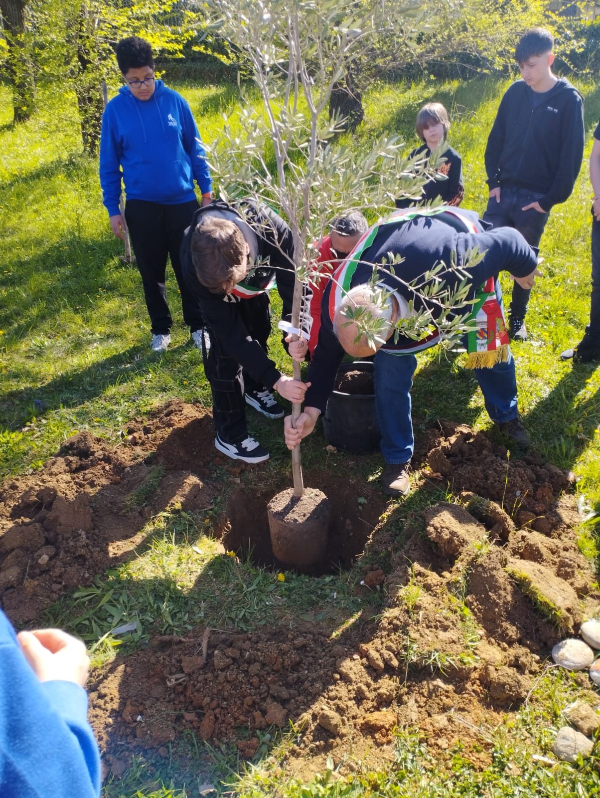 La buca preparata dallo ''stradino'' Luigi è stata pulita dai ragazzi che a turno hanno tolto la terra rimasta, poi i due sindaci hanno collocato l’ulivo che è stato coperto di terra e innaffiato perché cominci ad attecchire nella zona del Giardino dei Giusti in cui è stato posizionato.