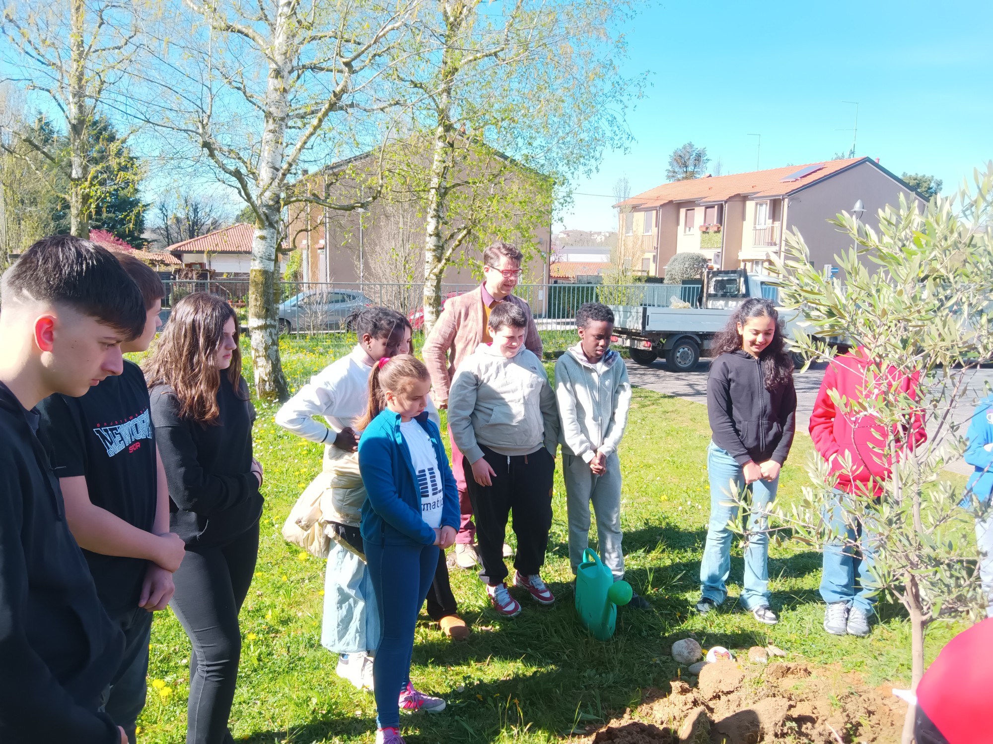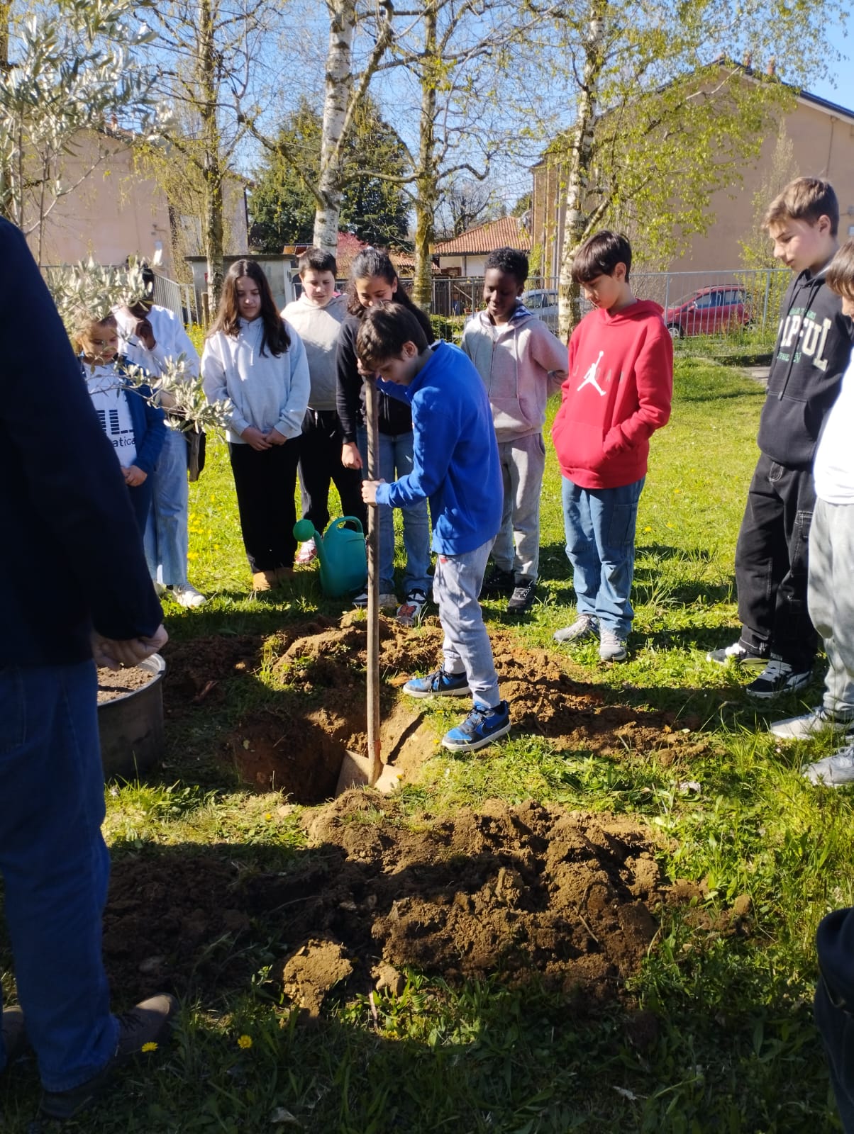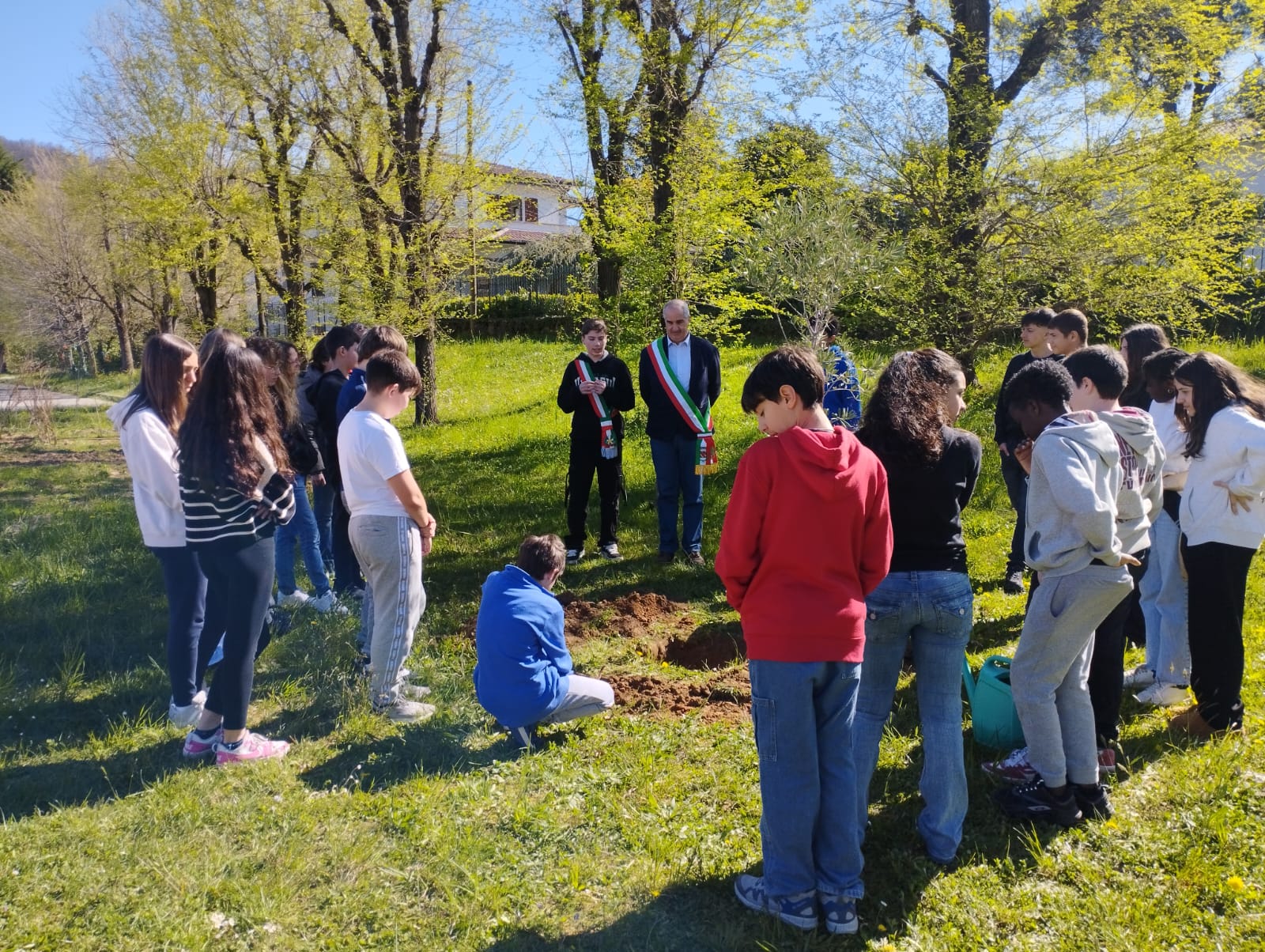 La buca preparata dallo ''stradino'' Luigi è stata pulita dai ragazzi che a turno hanno tolto la terra rimasta, poi i due sindaci hanno collocato l’ulivo che è stato coperto di terra e innaffiato perché cominci ad attecchire nella zona del Giardino dei Giusti in cui è stato posizionato.