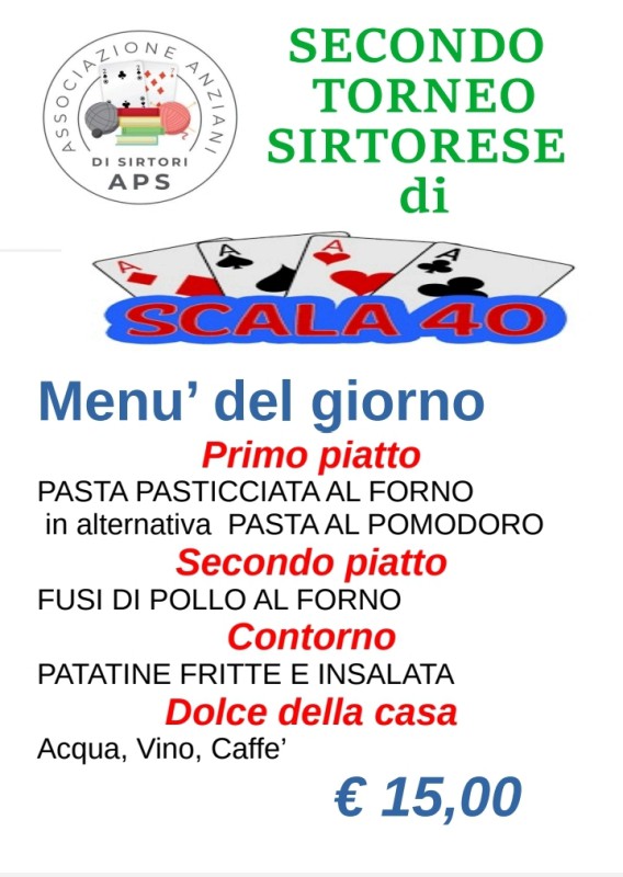 Si terrà domenica 26 aprile presso l'oratorio di Sirtori, la seconda edizione del Torneo di Scala Quaranta organizzato dall'Associazione Anziani APS e dagli Amici di Cascina Selvatico.